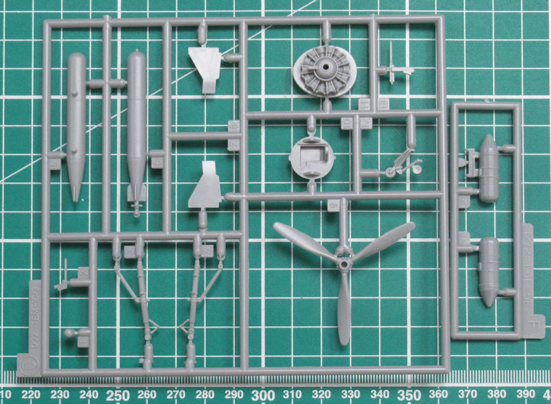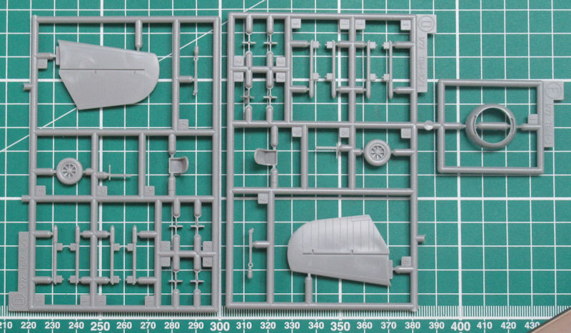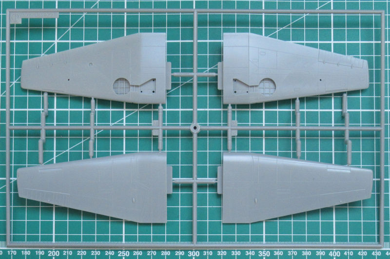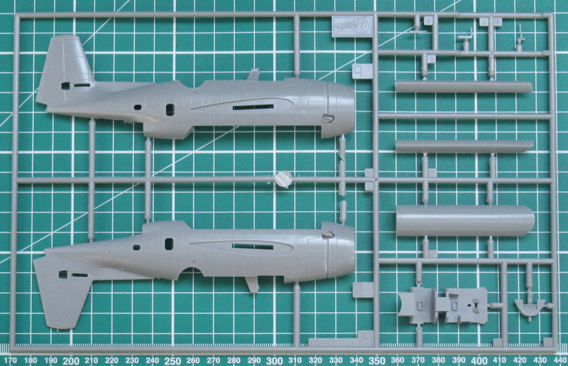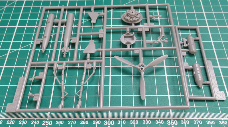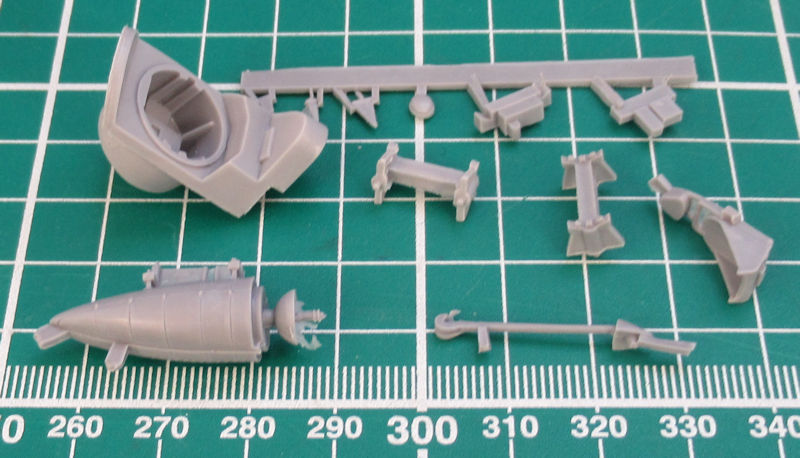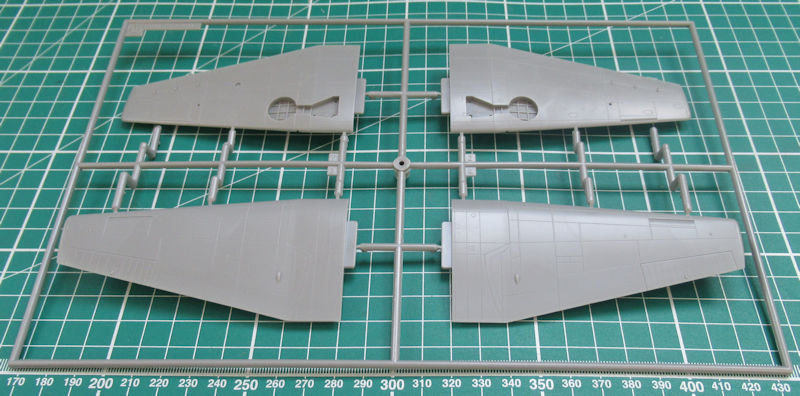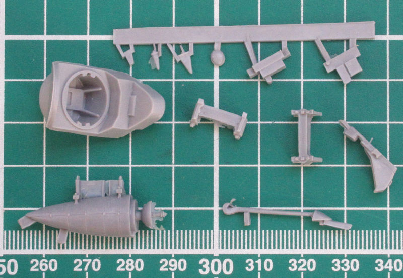 Vorn gibt es eine Platte mit einem Motorrelief. Allerding ist davon wenige zu sehen, denn die enge Motorverkleidung lässt nur einen kleinen Einblick zu. Vor dem Zusammenbau der Tragfläche müssen noch ein paar Bohrungen hergestellt werden. Für diese Variante liefert Hasegawa neue Halterungen aus Resin für die Ausrüstung mit. Scharfe Hinterkanten gibt es nur beim Höhenleitwerk. Das Fahrwerk besteht aus wenigen Teilen aber sieht recht ordentlich aus.