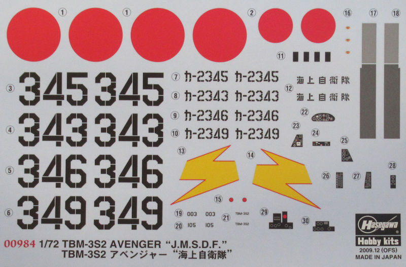 Bausatz: Der Bausatz der Grumman TBM Avenger erschien erstmals in 1/72 1995 bei Hasegawa. Seit dem erschienen regelmäßig diverse Auflagen. So gibt es hier eine japanischen Nachkriegsvariante als limitierte Auflage. Diese gab es schon 2008 erstmals und mit gleicher Nummer ist der Kit wieder erhältlich. In dem attraktiven praktischen Stülpkarton befinden sich gut verpackt sechs graue Spritzlinge mit 56 Einzelteilen, ein klarer Spritzling mit neun Teilen, drei klare Resinteile, zehn graue Resinteile, ein Decalbogen und die Bau- und Bemalungsanleitung.