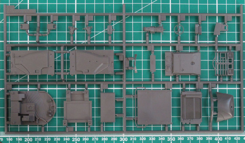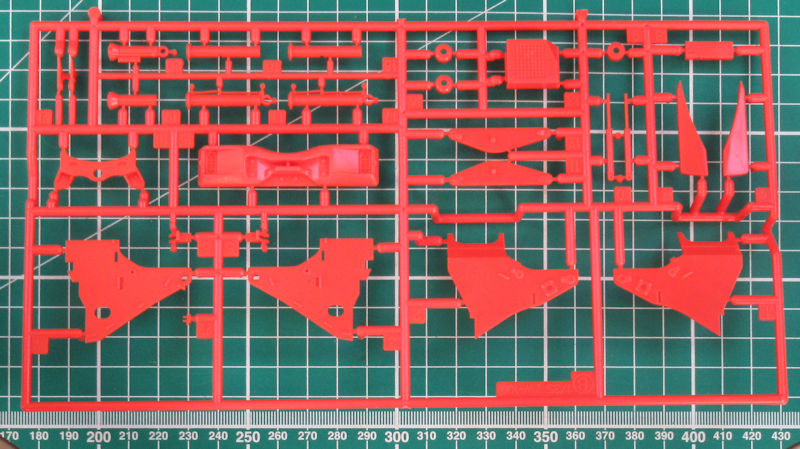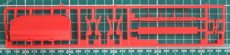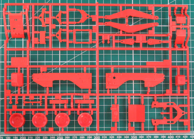 In dem attraktiven praktischen Stülpkarton befinden sich sehr gut verpackt vier Gummireifen, eine Kunststoffschnurr, ein hellgrauer Spritzgussrahmen mit 24 Teilen, drei dunkelgraue Spritzgussrahmen mit 70 Teilen, drei orangefarbene Spritzlinge mit 64, ein Klarsichtteil mit 18 Teilen, vier Polyclips, ein Decalbogen und die mehrfarbige Bau- und Bemalungsanleitung.