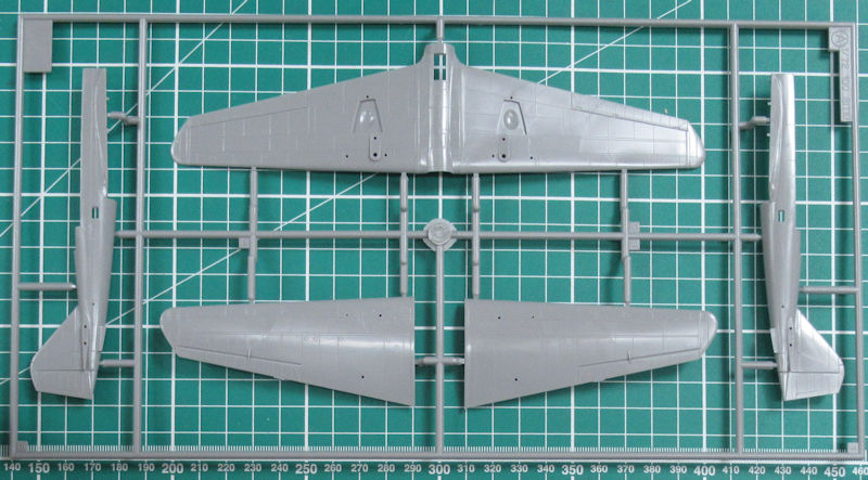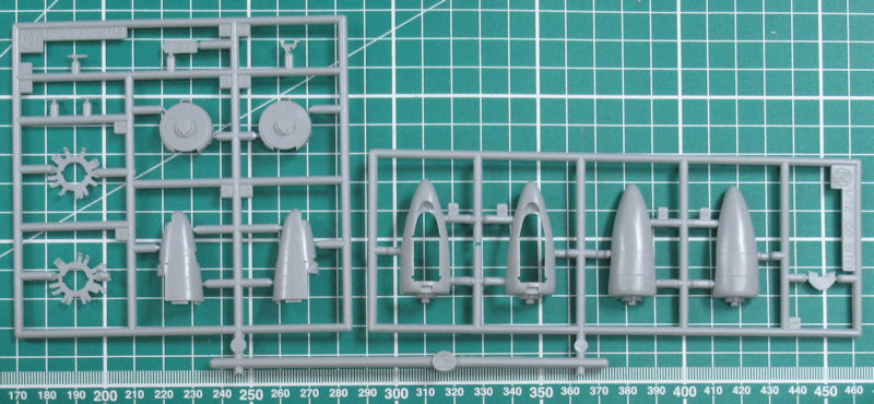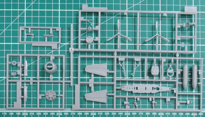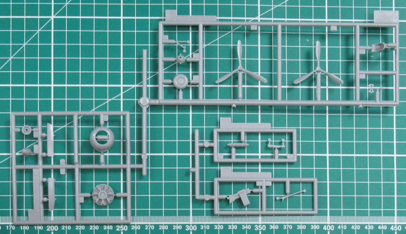 Hasegawa hat die Luftschrauben komplett aus einem Stück reproduziert. Nur die Spinner werden separat aufgeklebt. An der Rumpfunterseite werden zwei Halterungen samt Ta-Bomben angebracht. Die beiden Bug-MG sind etwas einfach. Ersatz gibt es leider nirgendwo. Das Fahrwerk ist recht gut nachgebildet. Die Klappen für das Spornrad sind am Rumpfheck befestigt.