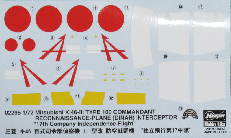 Bausatz: Im Jahre 2000 erschien die Mitsubishi Ki-46 erstmals im Maßstab 1/72 bei Hasegawa. Seit dem gibt es immer wieder verschiedene Auflagen in unterschiedlichen Varianten. Der Basisbausatz ist immer identisch. In diesen praktischen Stülpkarton befinden sich sehr gut verpackt elf hellgraue Spritzlinge mit 64 Teilen, zehn Klarsichteile(verteilt auf drei Spritzlinge), ein Decalbogen und die schlichte Bau- sowie Bemalungsanleitung.