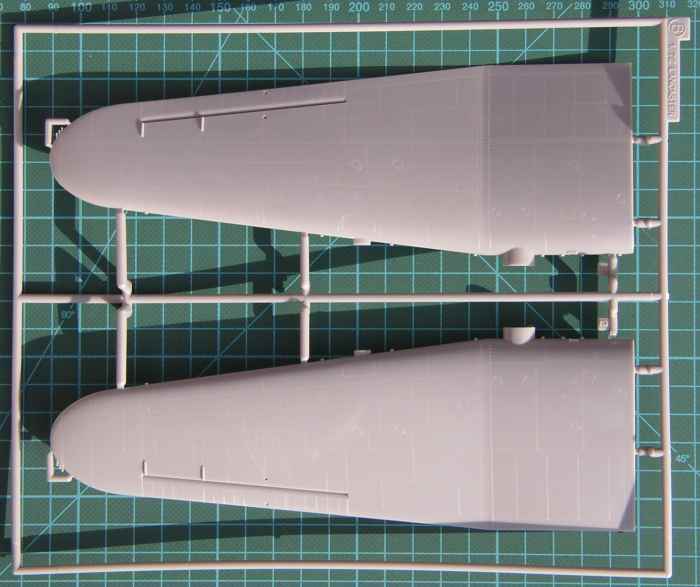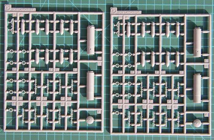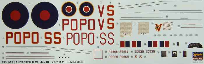 Die Hauptfahrwerksschächte sind in der Tragflächenunterseite vorgeprägt und sehr tief. Hasegawa hat die Hauptfahrwerksräder abgeplattet wiedergegeben. Im Rumpf sind alle für die frühen Lancaster und auch die Manchester charakteristischen Seitenfenster als Glatteile vorhanden. Hier hat sich Hasegawa noch einige Optionen offen gelassen. Wer die Lancaster in eine Manchester zurückverwandeln möchte, der hat es einfacher. Der Bombenschacht ist auch von innen detailliert und lässt sich somit offen bauen. Im Bausatz sind beide Luftschraubentypen (Hamilton A5/138 und de Havilland D.H. 5/40) vorhanden. Ebenso sind die Auspuffstutzen und die verkleideten Abgassammler als Alternativteile am Spritzling. Die Decals sind hervorragend gedruckt, jedoch sind sie nicht immer eine Verkleinerung der Originalmarkierungen. Insbesondere bei der PO-S (R5868) gibt es einige Abweichungen (allerdings auch immer den Zeitraum beachten, da die Maschine bis Kriegsende flog und nun in Hendon ausgestellt ist.) Übrigens: Das Decal für das Armaturenbrett ist für eine Manchester und Reich schreibt sich immer noch mit "R".