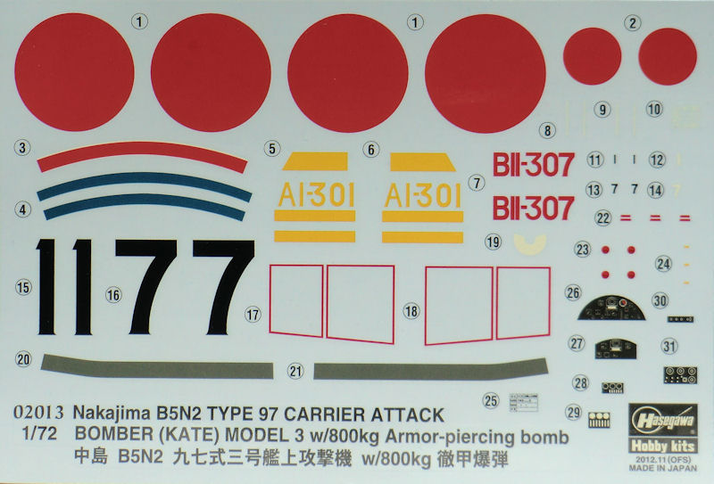 Bausatz: Der Bausatz der Nakajima B5N2 in 1/72 erscheint hier in einer modifizierten und limitierten Version. Er erschien seit den 80er Jahren bei Hasegawa in diversen Varianten und basiert auf dem Bausatz von Mania aus den 60er Jahren des vorherigen Jahrhunderts. Trotz alledem befinden sich in dem attraktiven Stülpkarton vier hellgraue Spritzlinge mit 43 Teilen, fünf Klarsichtteilen, einem Metallgussteil, ein kleinem Fotoätzteilbogen, die Decals und die typische Bauanleitung von Hasegawa. Der Bausatz erschien auch schon als B5N1 mit einer anderen Motorpartie.