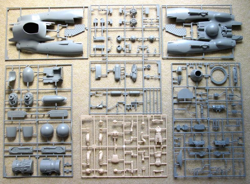 Im recht großen Karton, dessen Aussehen an die alten NITTO-Boxen angelehnt ist, finden sich sechs sauber gespritzte Gußäste, wovon einer den Piloten und eine Mechanikerin im klassischen SF3D-Outfit enthält. Beim Piloten besteht die Möglichkeit zur Wahl zwischen Kopf mit Helm oder Lederhaube.
