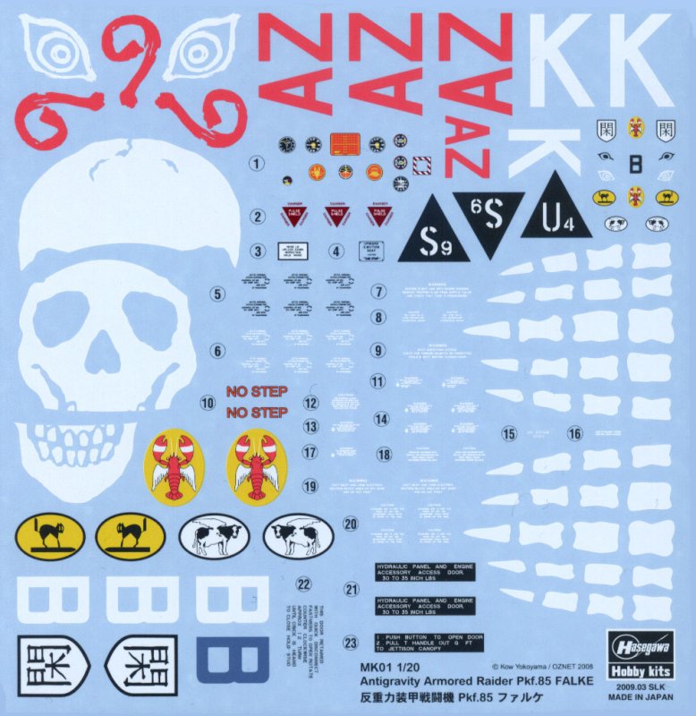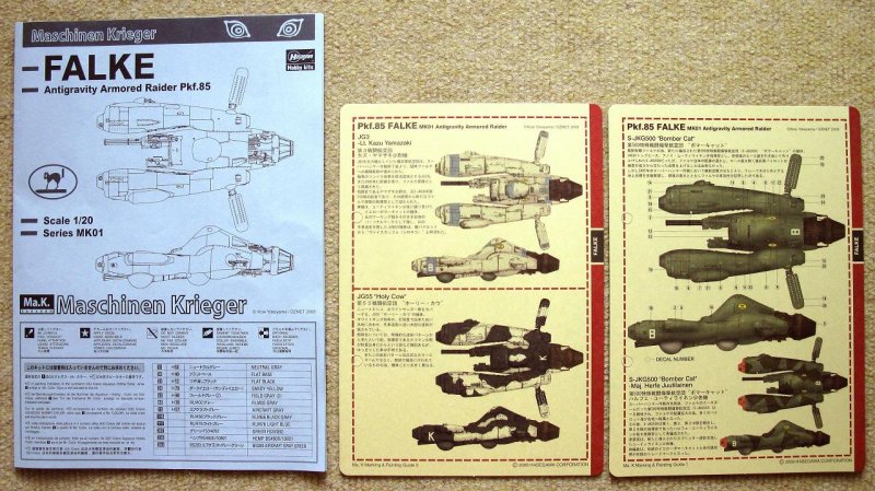 Eine übersichtliche Bauanleitung führt uns auch ohne Japanisch-Kenntnisse zum Erfolg und beinhaltet sogar Farbangaben in Englisch. Der umfangreiche Decal-Bogen ermöglicht den Bau von 8 unterschiedlichen Maschinen. Hierfür liegen auch wieder zwei der beliebten Daten-Karten bei, von denen jede 4 Bemalvorschläge bereithält.