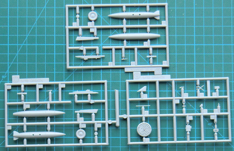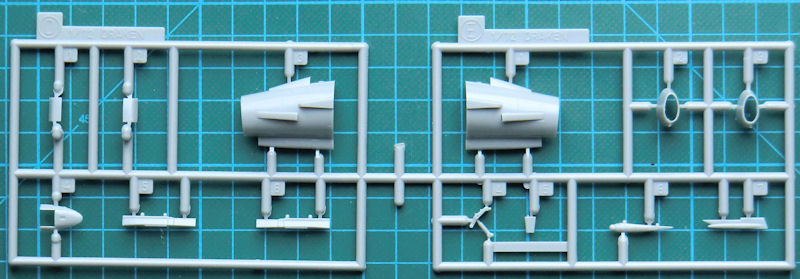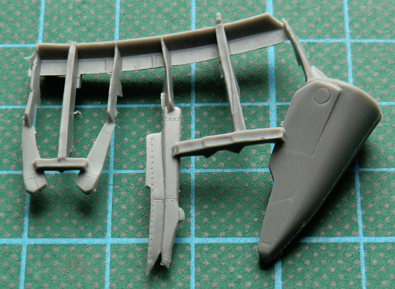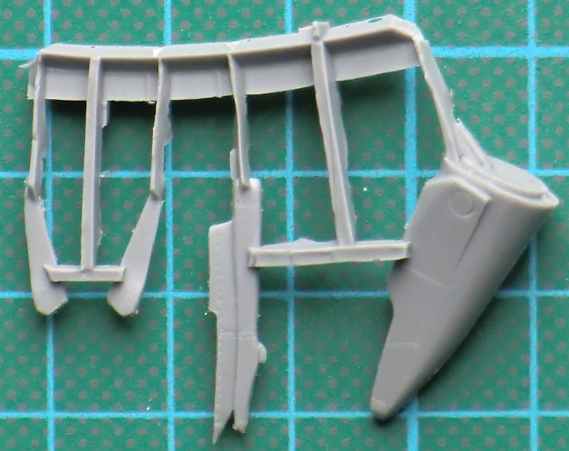 Das Fahrwerk sieht recht brauchbar aus. Die Schächte sind recht flach. Der Kamerabug ist ein Resinteil. Auch die Enden der Tragfläche bekommen neue passende Resinteile. Das vierte Resinteil wird auf das Seitenleitwerk geklebt. Damit sind die Unterschiede des Aufklärers einfach umgesetzt.