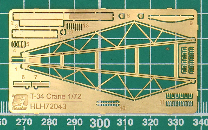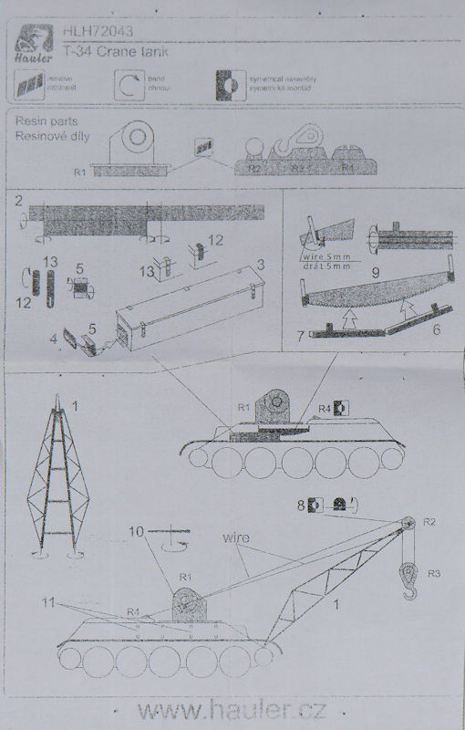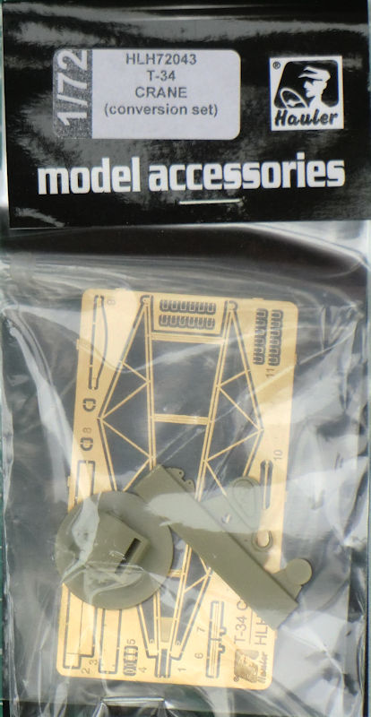 Bausatz: Hauler aus Tschechien bringt hier einen interessanten Umbausatz für den T-34 in 1/72 heraus. Das ist Gitterkran auf dem T-34-Fahrgestell. In der etwas unpraktischen Verpackung befinden sich vier Resinteile, eine Fotoätzplatine und die einfache Bauanleitung.