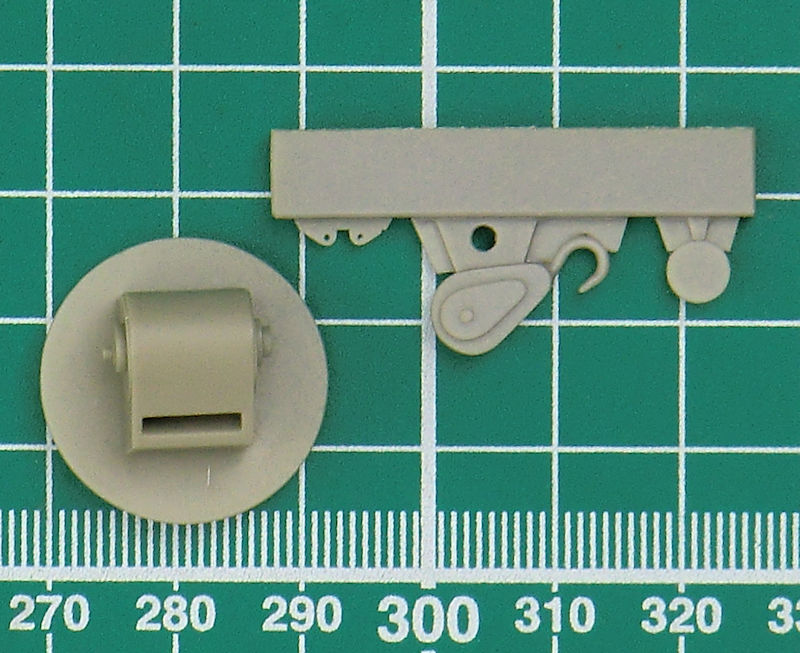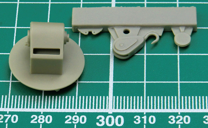 Der Guss der Resinteile ist tadellos. Eine Staukiste und der Gitterausleger müssen aus Fotoätzteilen gefaltet werden. Ergänzt werden müssen nur noch die "Stahlseile" in 1/72. Weiterhin gibt es noch eine geätzte Säge samt Halterung.