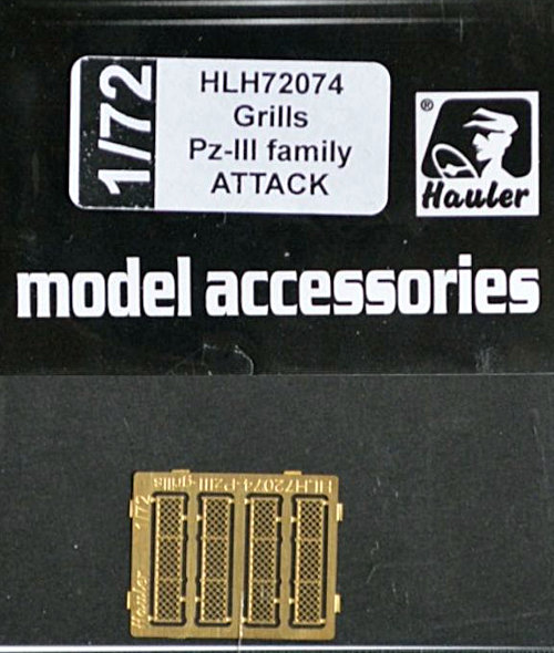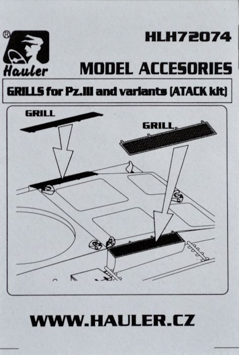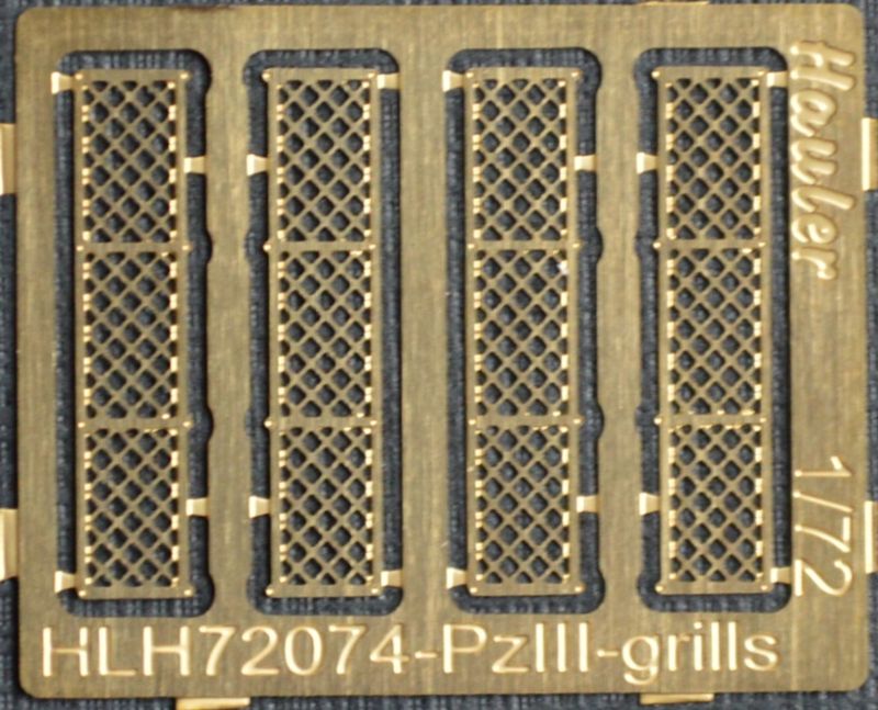 Oftmals fehlen bei Spritzgussbausätzen die Lüfterabdeckungen oder sie sind im Plastik direkt eingeprägt, wodurch nur eine bedingt plastische Wirkung erreicht wird. Die tschechische Firma Hauler hat sich diesem Problem für die Panzer III-Familie in 1:72 gewidmet. In dem Plastikbeutel befindet sich, durch Karton vor Beschädigung geschützt, eine kleine Fotoätzplatine mit insgesamt 4 Grätings, geeignet also für 2 Fahrzeuge. Sie besitzen an den Seiten jeweils 4 Befestigungen, was beim ankleben beachtet werden sollte. Die Gitter sind flach und maßstäblich ein bisschen zu breit, die Wirkung am Modell wird aber trotzdem deutlich aufgewertet.