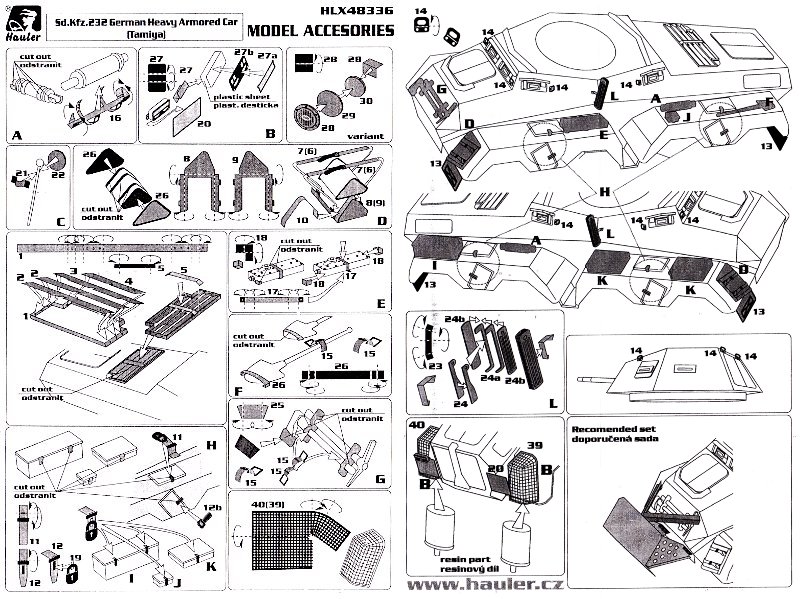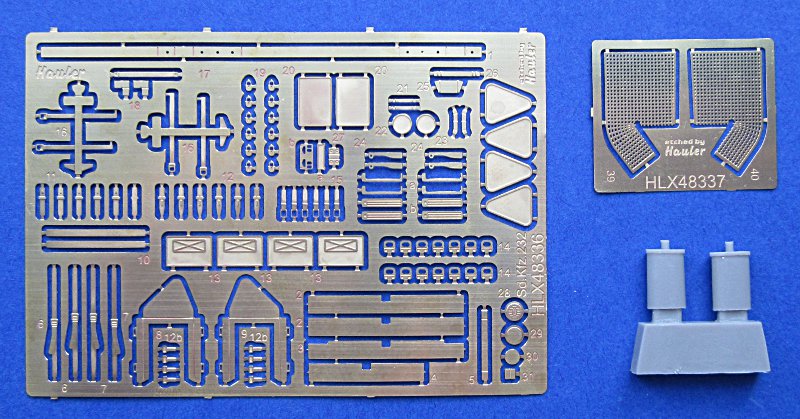 Dieser Satz dient der grundsätzliuchen Detaillierung des Chassis von Tamiyas Sd.Kfz.232. Etliche Verschlüsse und Werkzeughalterungen werden ausgetauscht. Der Feuerlöscher, das Kolonnenfahrgerät, die Zusatztanks und der Wagenheber sind neben den diversen Kisten und Fächern im Fokus dieser Maßnahmen. Die Lüfteröffnung auf dem Fahrzeug wird komplett neu aufgebaut. Dafür sollte man über ein wenig Erfahrung verfügen. Auch jeder Winker wird aus 7 Teilen aufgebaut! Für die Auspufftöpfe (aus Resin) liegen Schutzgitter bei.