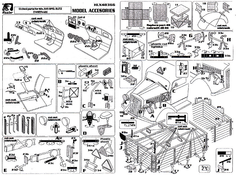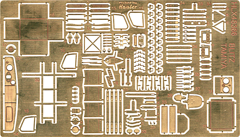 Auch diesmal gibt es wieder einen umfangreicheren Satz, der ein wenig Erfahrung mit dem Verarbeiten solchen Zubehörs erfordert. Los geht's im Führerstand, wo das Instrumentenpanel durch Fotoätzteile mit mit Folie ersetzt und die Pedalerie ergänzt wird. Die Türen erhalten neue Scheiben aus Azetatfolie und Fotoätzteile für den vorderen Rahmen. Der Türöffner und die Scheibenkurbel werden ergänzt. Scheibenwischer, Kolonnenfahrlicht und Rückspiegel werden ersetzt. Zusätzlich gibt es einen Stander und Winker. Lampen und Notek-Scheinwerfer erhalten neue Halterungen, ebenso das gesamte Werkzeug. Das Klappschild für den Anhängerbetrieb wir ebenfalls aufgebrezelt. Natürlich bekommt das Modell auch den Opel Blitz Schriftzug. Die vielen kleinen Details entnimmt man am besten der Bauanleitung unten. Da ist viel Fummelkram dabei, weshalb die eingangs erwähnte "Erfahrung" hier noch einmal von mir bemüht wird...