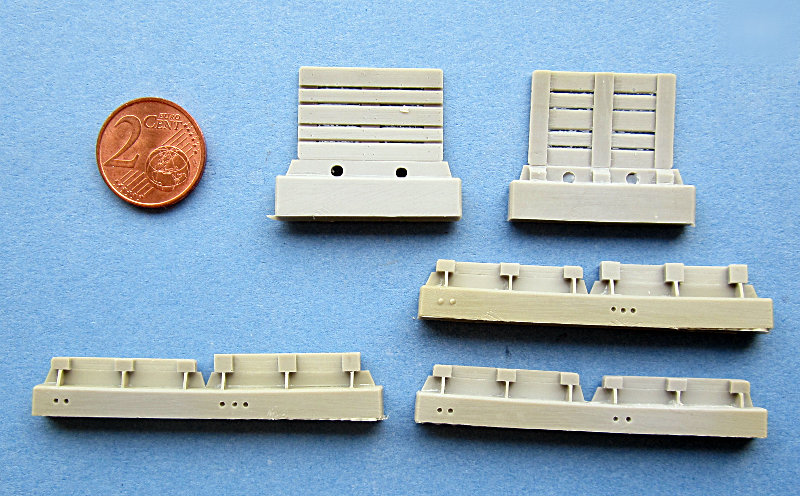 Bausatz: Der Bausatz erlaubt den Bau von 2 Europaletten, welche jeweils aus 4 Teilen besteht. Der Zuammenbau ist einfach. Das Abtrennen vom Gussblock sollte mit dem Skalpell oder einer PE-Säge kein Problem sein. Zum Versäubern von der Gusshaut empfiehlt sich eine alte harte Zahnbürste.