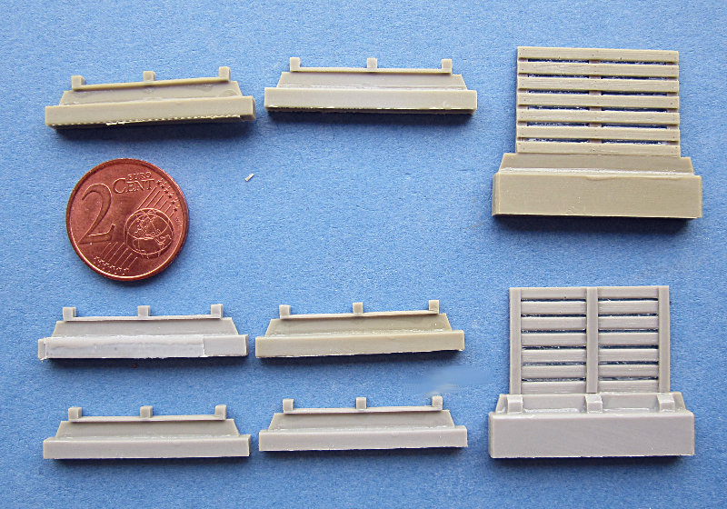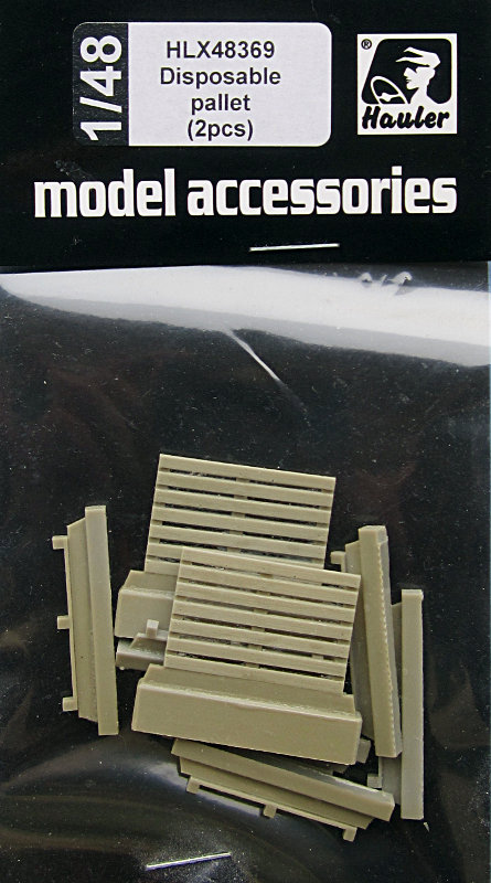 Bausatz: Der Bausatz erlaubt den Bau von 2 Einwegpaletten im Euromaß, welche jeweils aus 4 Teilen besteht. Der Zuammenbau ist einfach. Das Abtrennen vom Gussblock sollte mit dem Skalpell oder einer PE-Säge kein Problem sein. Zum Versäubern von der Gusshaut empfiehlt sich eine alte harte Zahnbürste.
