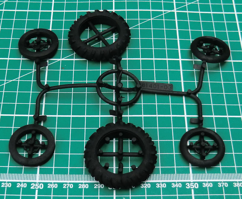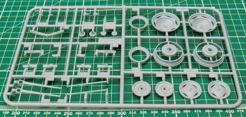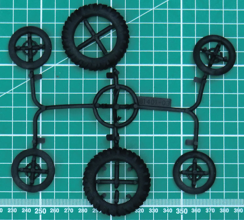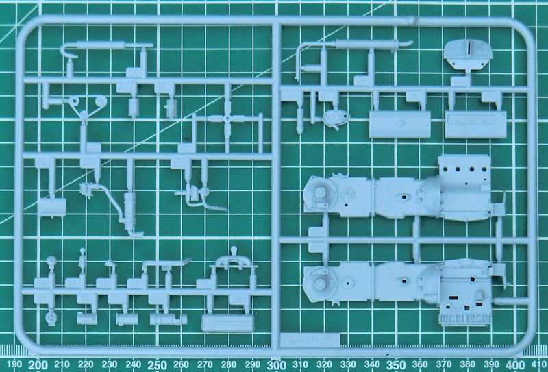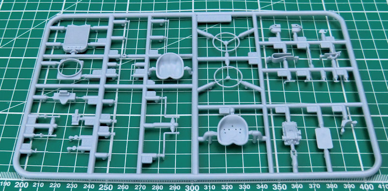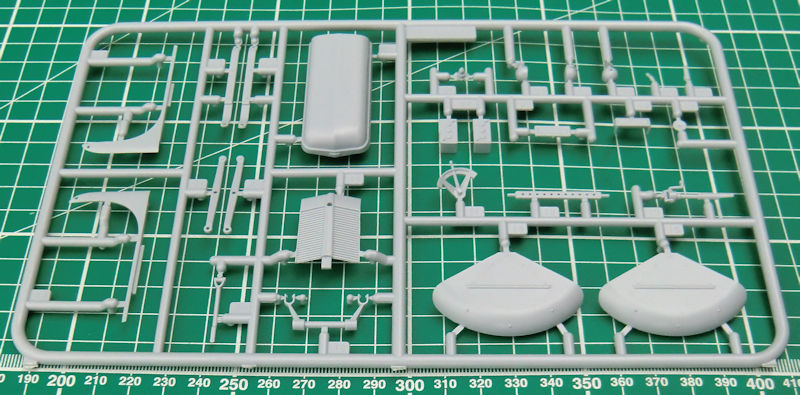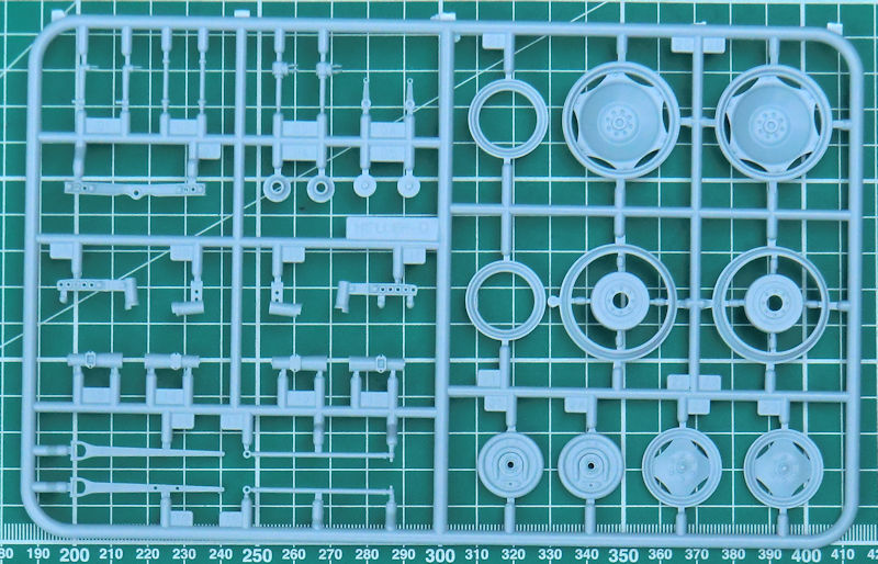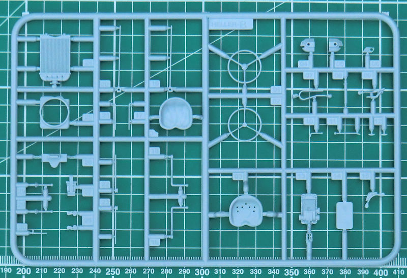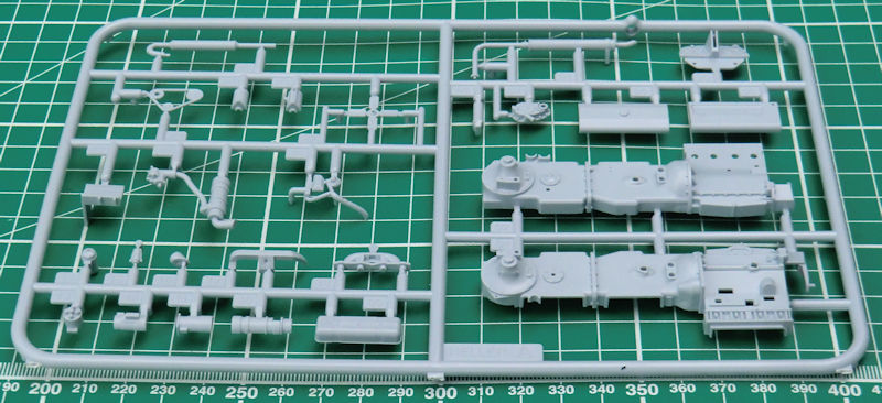 In dem etwas zu großen aber sehr praktischen Karton befinden sich sehr gut verpackt vier hellgraue Spritzlinge mit 122 Teilen, sechs Gummireifen, ein kleiner Decalbogen und die informative Bauanleitung. Die Abspritzung der Bauteile ist in Ordnung und passt in die Zeit.