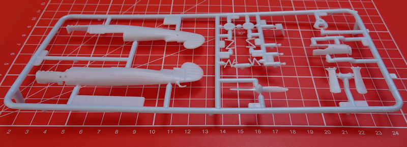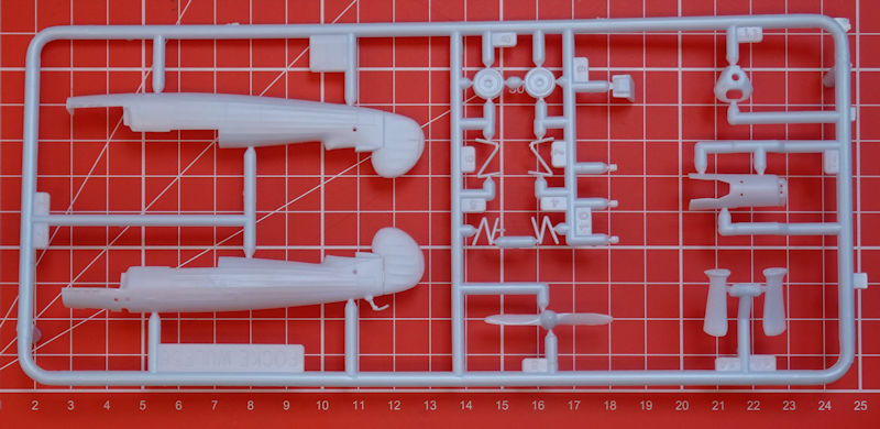 Im Cockpit findet man eine Bodenplatte, den Steuerknüppel, einen Sitz und ein Instrumentenbrett. Dafür gibt es auch ein Decal. Letzteres hätte ich mir auch für die Sitzgurte gewünscht. Der Rumpf wird aus wenigen Teilen zusammengebaut. Die beiden MG-Läufe sind anmodelliert. Aus einem Stück besteht die Luftschraube samt Spinner. Das Seitenruder ist ein wenig zu stark. Nur am Höhenruder gibt es eine scharfe Hinterkante.