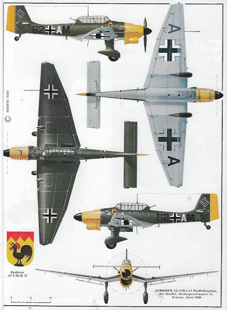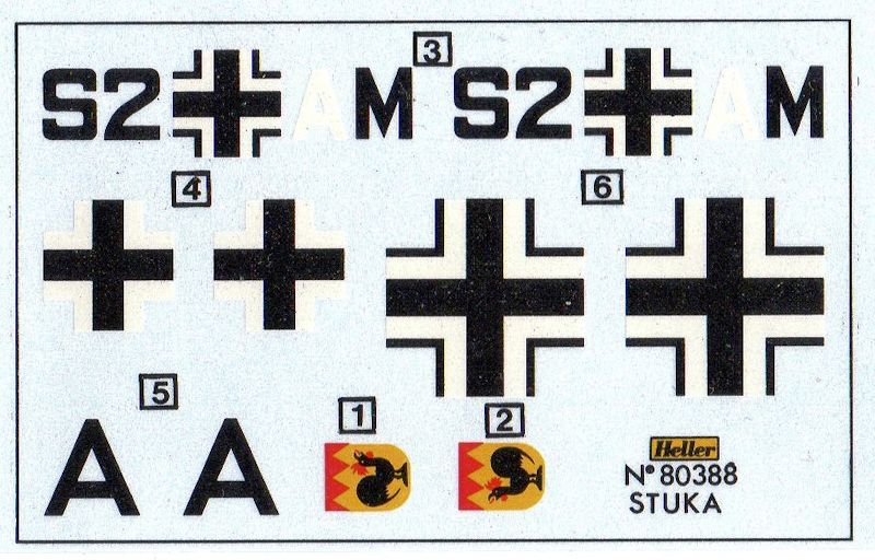 Bemalung: Zu klein geraten ist auch der karge Decalbogen, da es darauf neben den Hoheitsabzeichen und der Kennung nur zum Geschwaderwappen reichte. Wartungshinweise u.a. sucht man vergebens. Ein anderes Problem wäre die als Vorbild gewählte "Anton -Marta" selbst. Für Kenner kann dieses Flugzeug mit seiner gelber Motorverkleidung als auch dem Seitenruder nur eine Maschine darstellen, die am Balkanfeldzug teilgenommen hat. Dies galt aber offensichtlich nicht für den Grafiker, der gerade diesen Stuka für die farbige Vierseiten-Darstellung in der ehrwürdigen Profile-Publication-Buchreihe erkor. Offensichtlich glaubte er, diese müsse genau wie die solchermaßen dekorierten Bf 109, an der Luftschlacht um England teilgenommen haben.