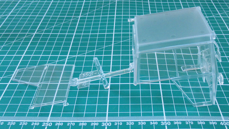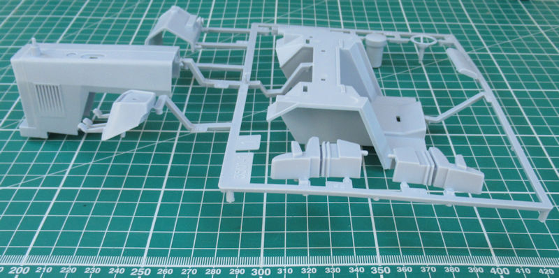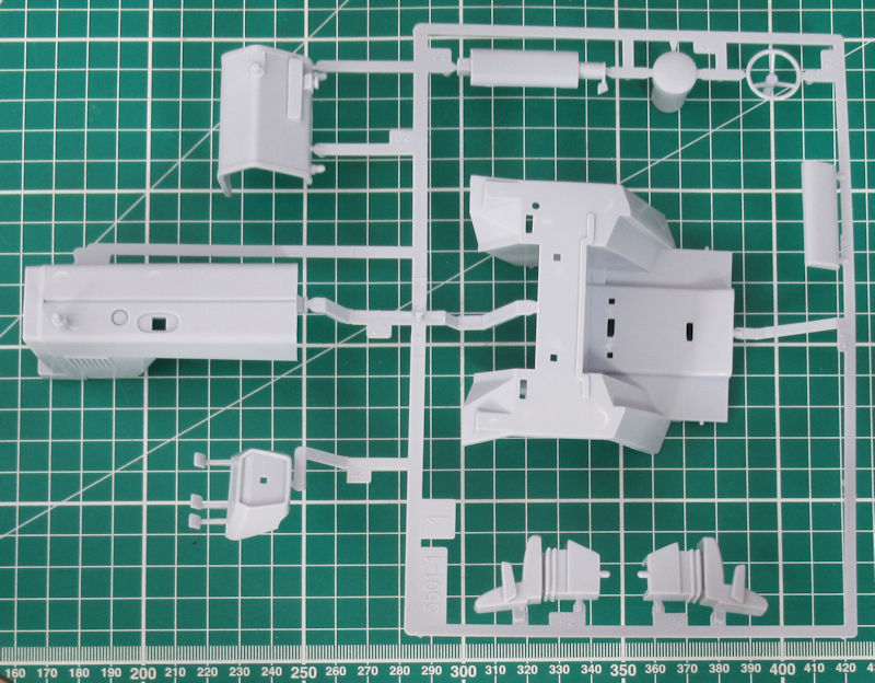 Der nächste Bauabschnitt beschäftigt sich mit dem Hubwerk. Das sieht sehr stimmig aus. Es folgt der Zusammenbau des zweiteiligen Motor-Getriebeblocks. Die untere Hälfte der Fahrerhauses wird dann darauf befestigt. Für die obere Kabine hat man sich etwas besonderes einfallen lassen. Es ist ein Klarsichtteil und das Dach sowie die Holme müssen bemalt werden. Die Fahrertür (links) ist einzeln vorhanden. Der Grammer-Luftsitz besteht aus zwei Hälften. Für das Instrumentenbrett gibt es ein Decal. Das gilt auch für Blinker und Rückleuchten. Die gelben Scheinwerfer mögen in Frankreich noch durchgehen aber für Deutschland sind sie unpassend. Hier sollte man die beiden Decals durch Klarsichtteile ersetzt werden.