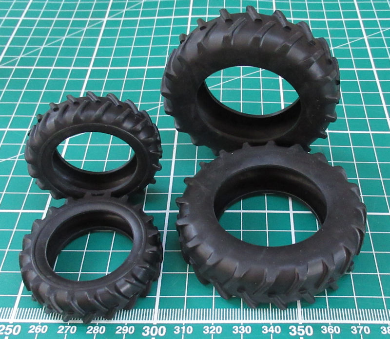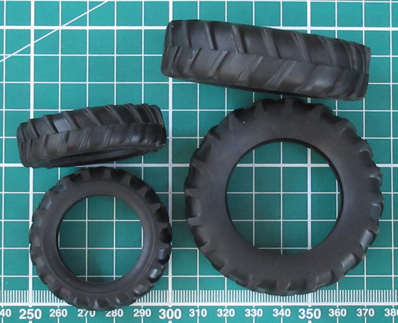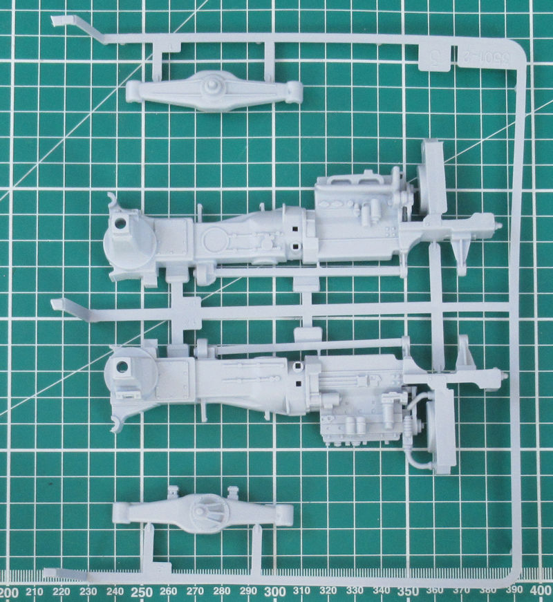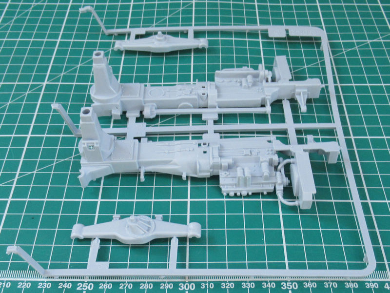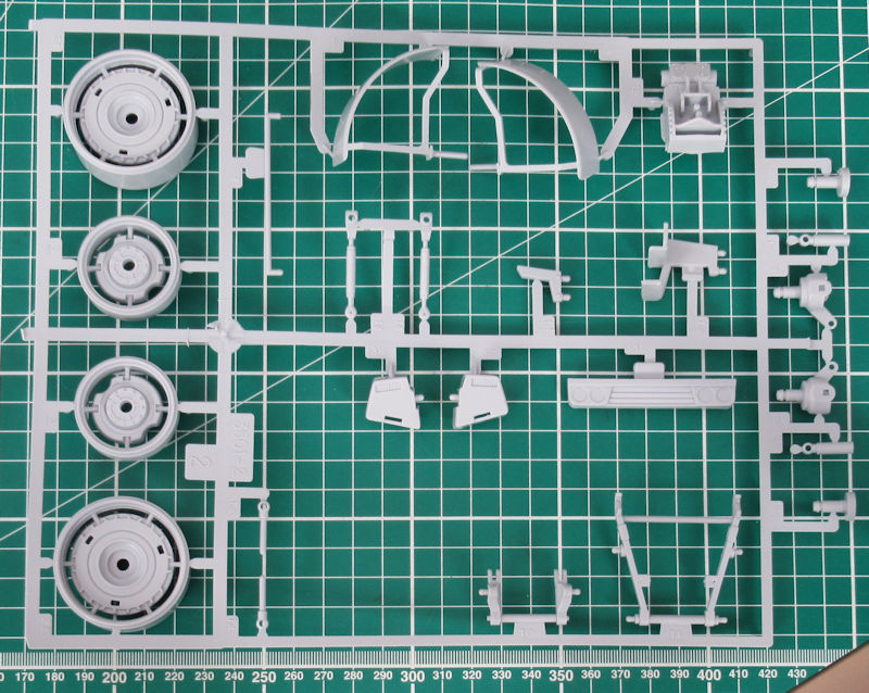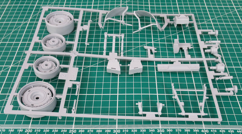Die Einzelteile sind sehr komplex aber es wirkt ohne Farbgebung ein wenig vereinfacht. Der Bau beginnt mit der Vorderachse. Ein paar Teile werden nur zusammengesteckt damit sie beweglich bleiben. Die Reifen haben ein schönes Profil. Leider fehlen die Größen und/oder Herstellerangaben.