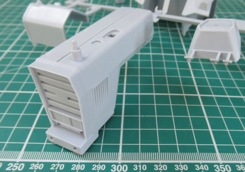 Die Motorhaube bildet mit der Kühlerfront eine Einheit. Damit kann sie leider nicht geöffnet werden. Der Luftfilter und der Auspuff sind einzeln und werden von oben in die Motorhaube eingeklebt.