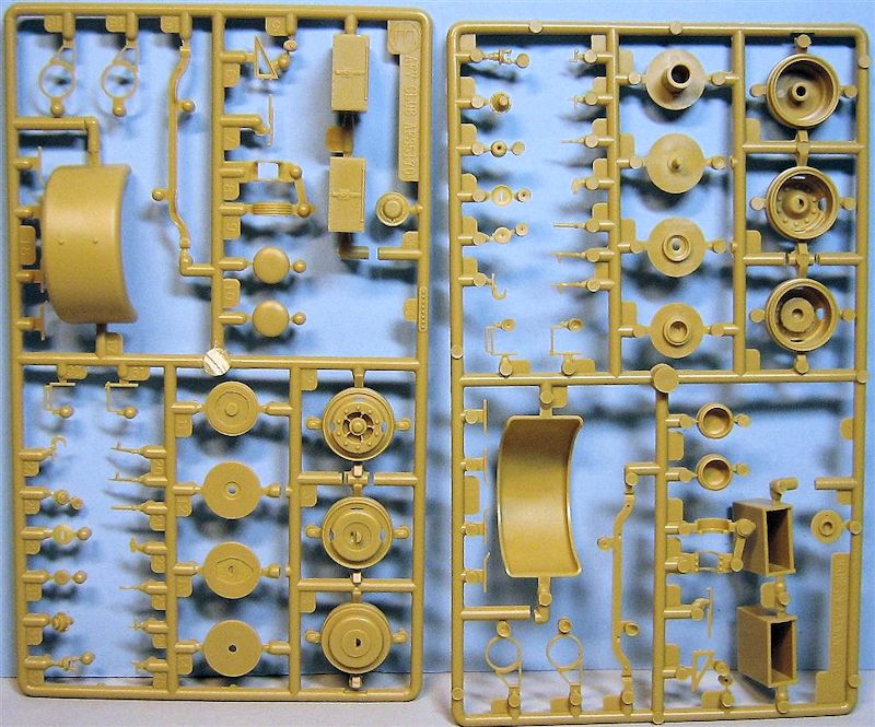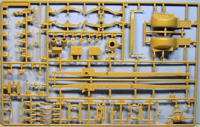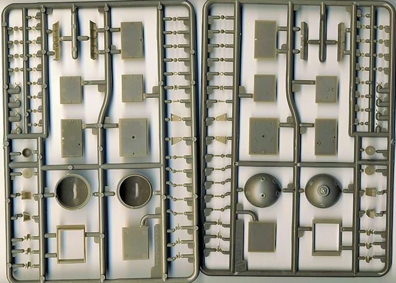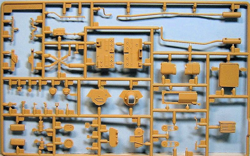 Im Bausatz enthalten sind: Neun sauber gespritzte Gießäste in beige, oliv bzw. transparentem Plastik, drei kleine Fotoätzteilplatinen mit Teilen für z.B. die Innenseite der Kühlerabdeckung, die hintere Kennzeichenhalterung und Teile für die EMC Minen, sieben Gummiräder und Polycabs, Taumaterial, vier Resinteile für die Marinefigur, vier Resinteile für die Transportgestelle der EMC Minen und zwei Decalbogen. Dank der 16-seitigen, übersichtlichen Bauanleitung, dürfte der Zusammenbau ohne größere Probleme von der Hand gehen.