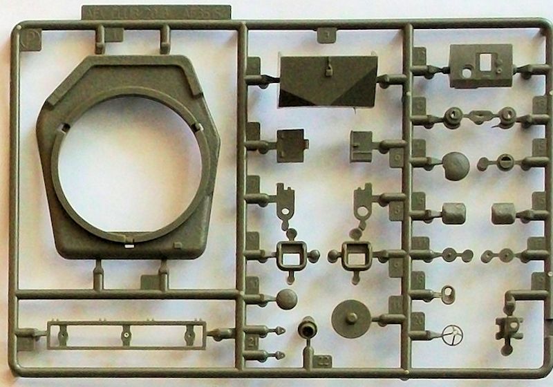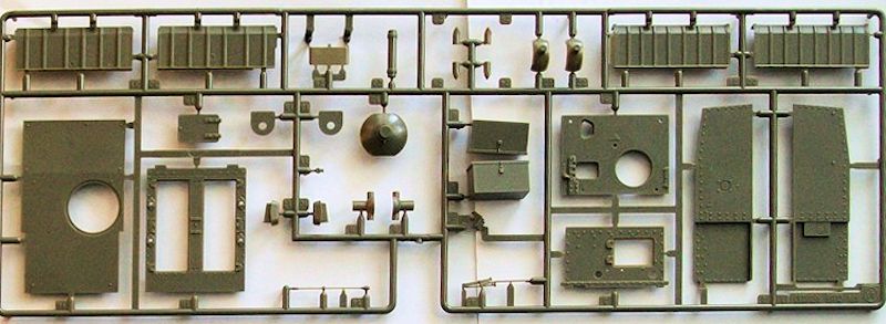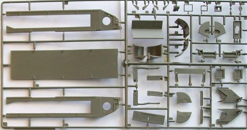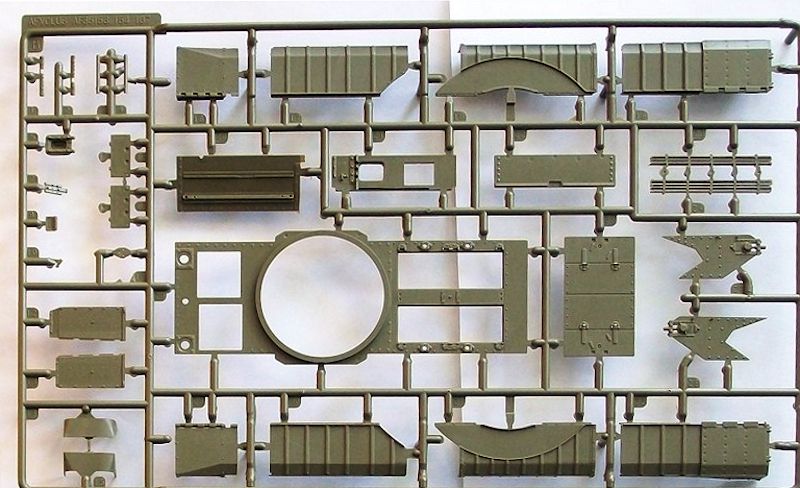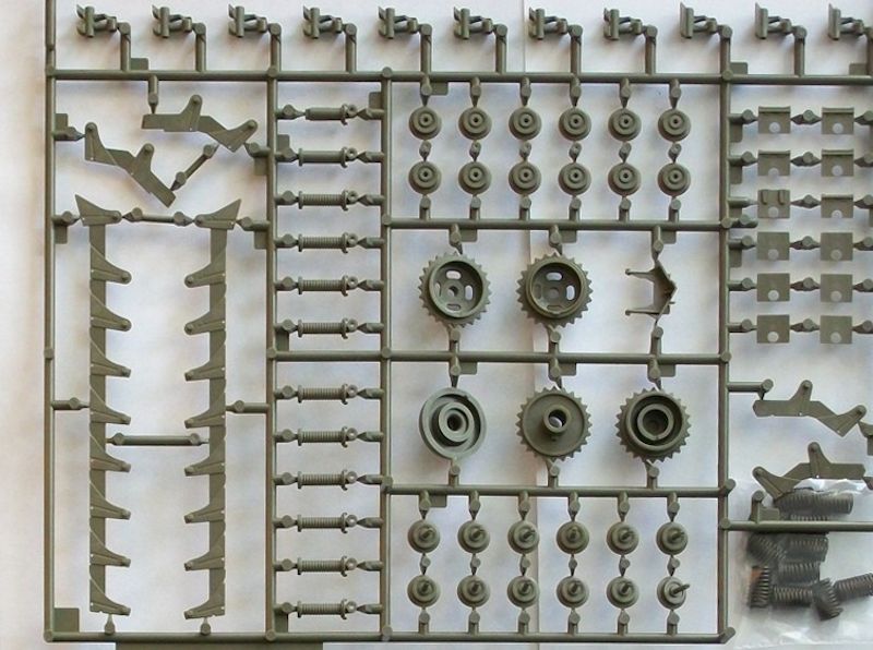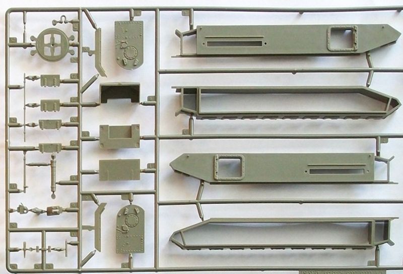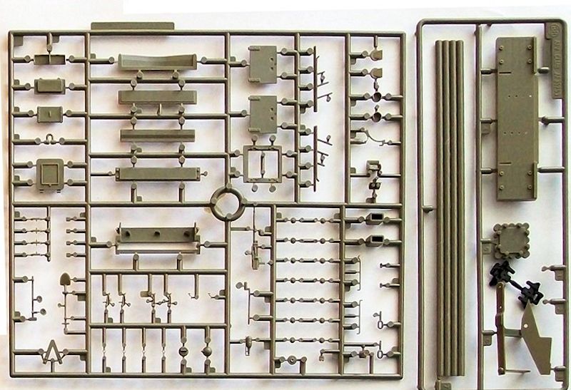 Bausatz: Der Bausatz wird in einem stabilen Karton geliefert. Er beinhaltet 10 Gießäste mit den Plastikteilen für die Selbstfahrlafette, einen Gießast mit Klarsichtteilen, vier kleine Ätzteilschablonen, diverse Metallfedern für das Laufwerk sowie eine Kordel für das Abschleppseil.