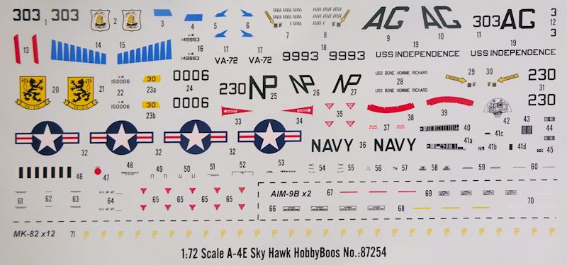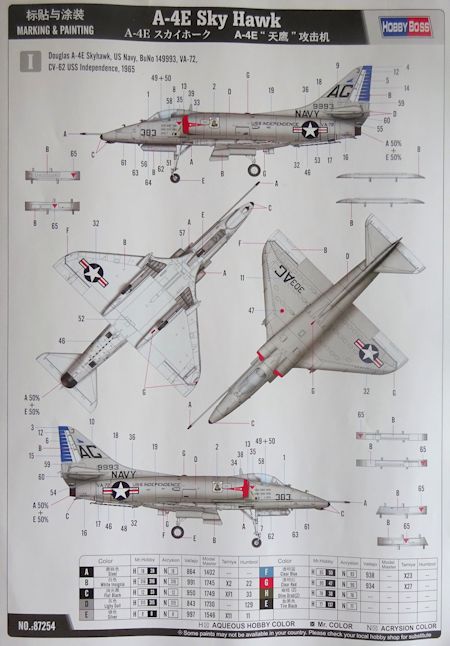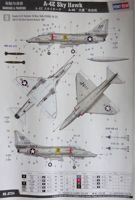 Bemalung: Die Bauanleitung führt in acht Schritten zum Ziel. Es liegen sauber gedruckte Abziehbilder für zwei US-Navy Maschinen bei. Farbangaben erfolgen in fünf verschiedenen Systemen.