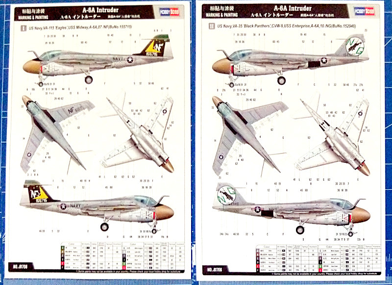 Bemalung: Zwei Optionen für die Kennungen sind vorhanden: Eine Maschine der U.S. Navy, VA-35 „ Black Panthers“ von der USS Enterprise, und eine Navy Maschine der VA-115 „Eagles“ von der USS-Midway. Beide Flugzeuge sind in dem damaligen Standartanstrich der U.S.Navy: Möwengrau oben/Weiß unten gehalten. Die Decals sind präzise im Druck und Stencils gibt es reichhaltig. Auch für die Waffen. Für die Bemalung werden Farben von vier Anbietern vorgeschlagen.