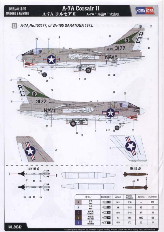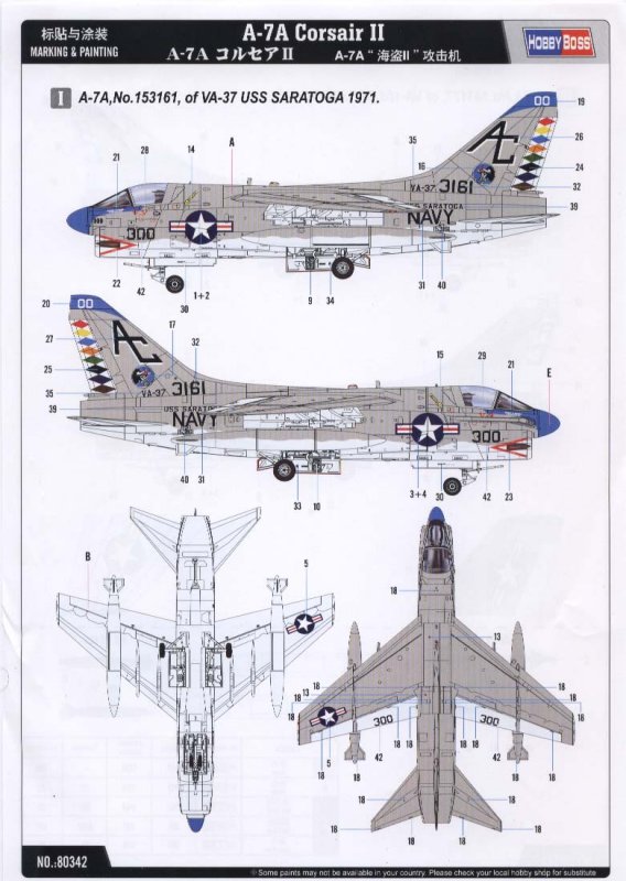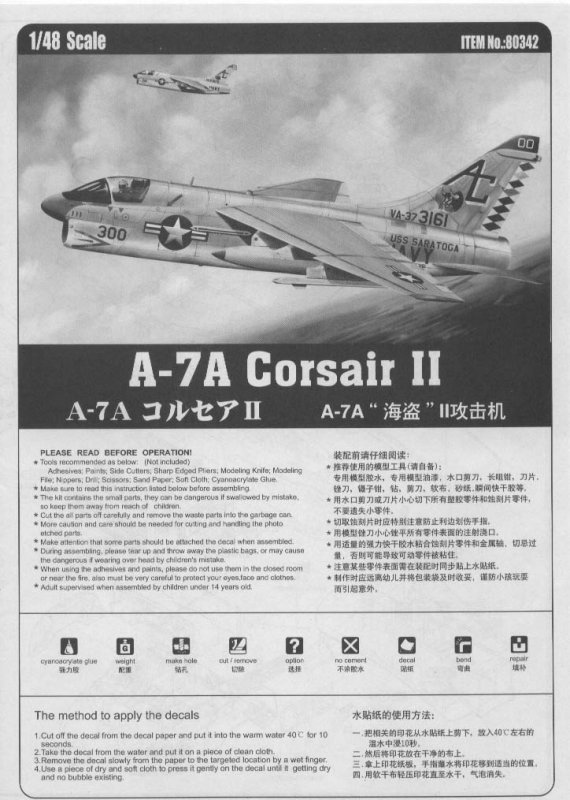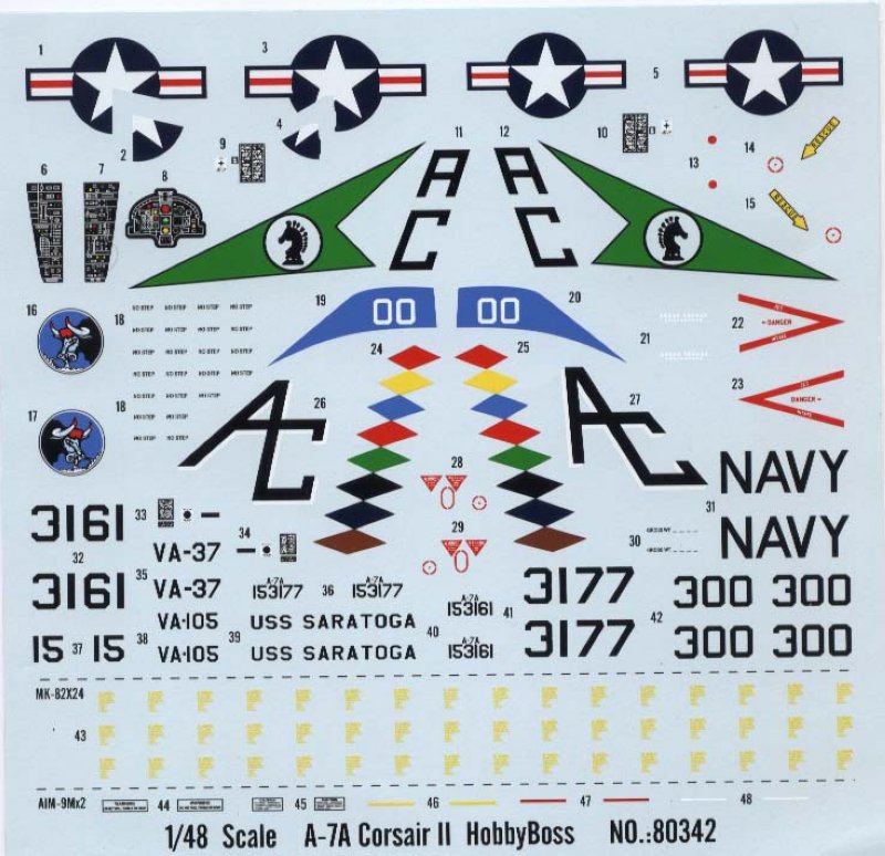 Das Modell wird mit dem typischen zweifarbigen Tarnanstrich lackiert den die U.S. Navy zur Zeit des Vietnamkrieges verwendet hat. Hier sollten Federal Standart Nummern verwendet werden. Die Lackierungshinweise gehen darauf nicht ein. Light Gull Gray FS 36440 und Insignia White FS 17875. Zwei Flugzeuge können aus den Decalbogen gebaut werden. Eine farbenfrohe Maschine der VA-37 aus dem Jahr 1971 und eine A-7A der VA-105 von 1973 beide waren auf dem Träger Saratoga stationiert.