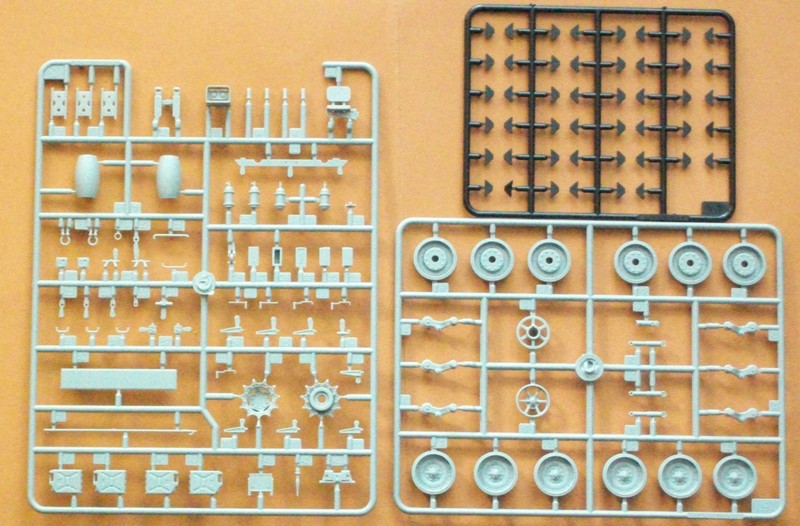 Bausatz: Das Modell besitzt Einzelkettenglieder aus Plastik und für die Lüftergitter einen kleinen Satz mit Ätzteilen. Die Innenausrüstung ist sehr umfangreich und detailliert dargestellt. Klarsichtteile für die Optiken und ein Stück Kordel für das Abschleppseil liegen auch bei.
