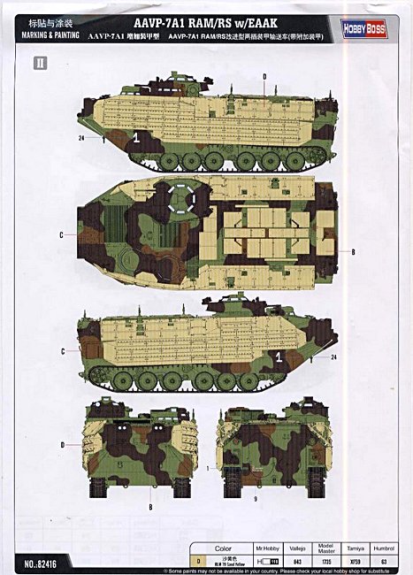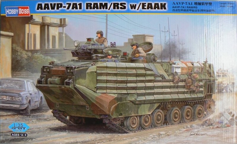 Mit dem AAVP-7A1 RAM/RS w/EAAK erscheint nun die letzte Version dieses interessanten Landungsfahrzeug, das hauptsächlich bei den US. Marines im Einsatz steht ist. Diese Version besitzt das neue Fahrwerk mit drei Stützrollen auf jeder Seite und dem EAAK (Enhanced Applicate Armour Kit). Die passive Zusatzpanzerung besteht aus dünnen abgewinkelten Karbonplatten und wird mit Abstand auf die Aluminiumwanne aufgebolzt. Die Panzerung widersteht 14,5 mm Geschossen und der Splitterwirkung von 155mm Artilleriegranaten. Die Besatzung des Fahrzeug, besteht aus drei Mann (Fahrer, Kommandant und Richtschütze). 25 Marines mit kompletter Gefechtsausrüstung kann der AAVP mitnehmen.