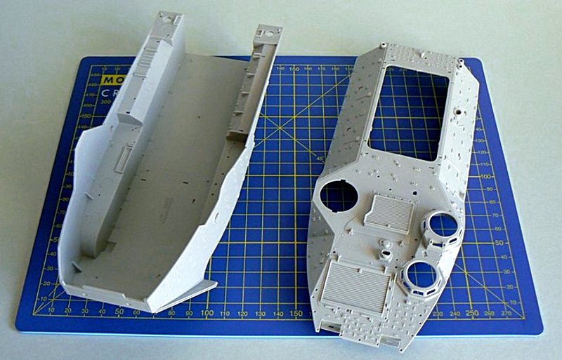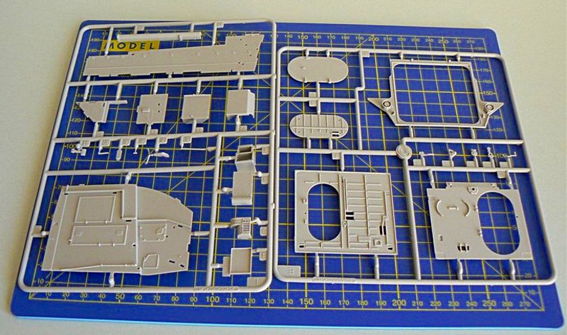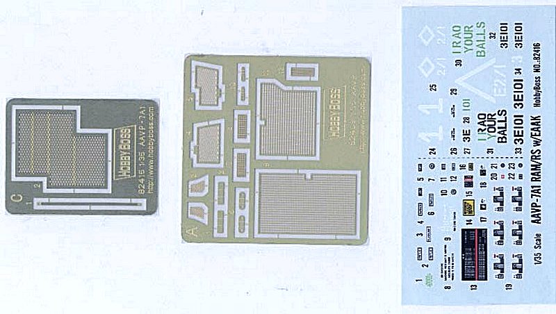 Auch die Zusatzpanzerung ist gut wiedergegeben. Zwei kleine sinnvolle Ätzteilplatinen liegen dem Bausatz bei. Die Bauanleitung ist gut und leicht verständlich. Nach 19 Bauabschnitten erhält man ein sehr gutes Modell des AAVP-A1 RAM/RS w/EAAK. Einziger Kritikpunkt an der Bauanleitung ist, das sie gefaltet ist. So ist sie leicht unübersichtlich. Hier wäre Heftform besser gewesen
