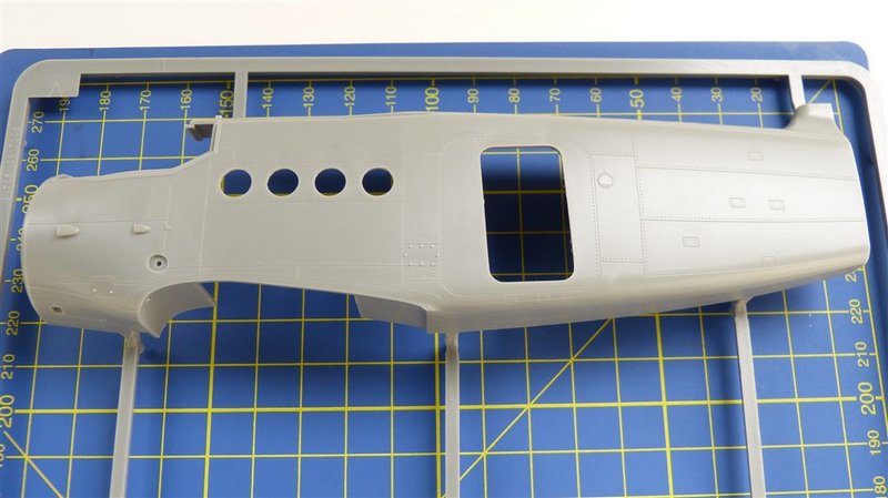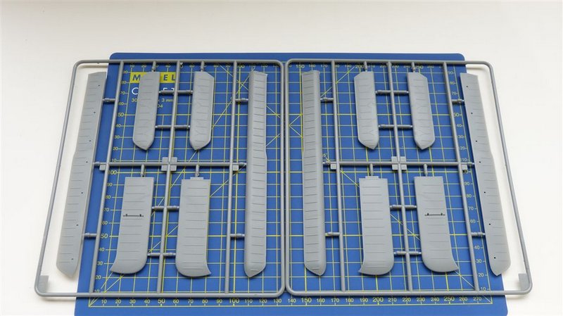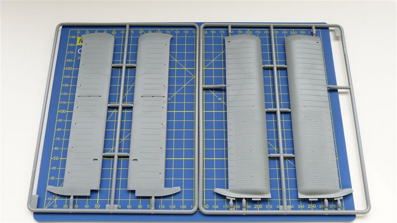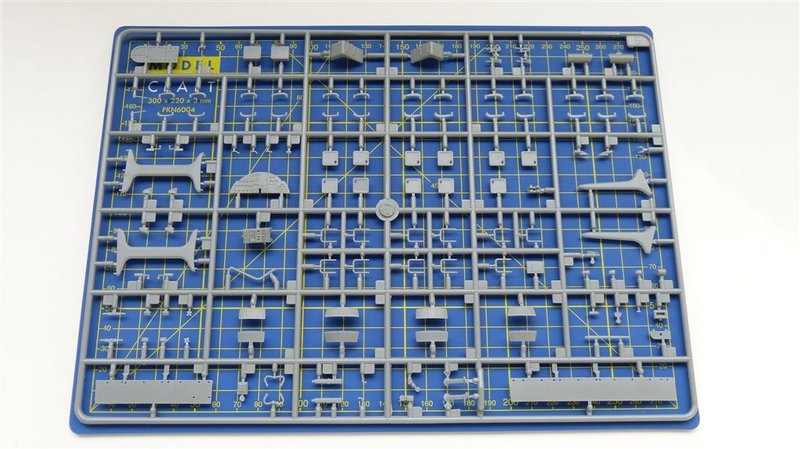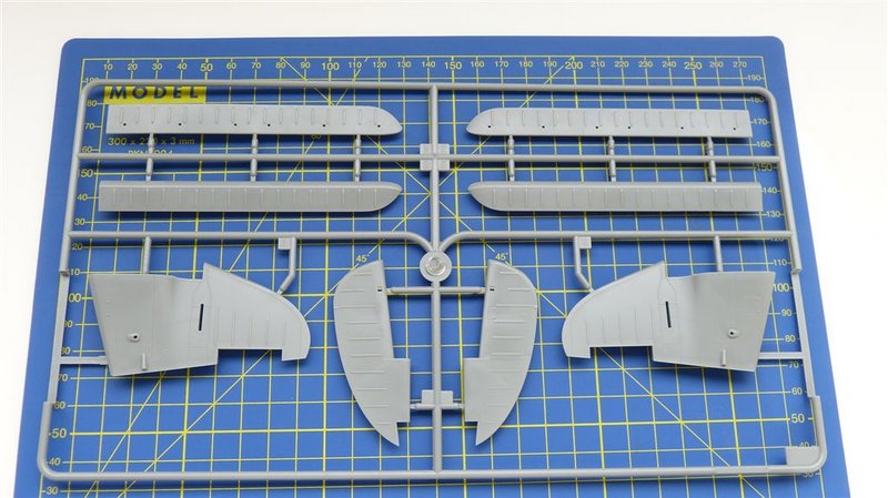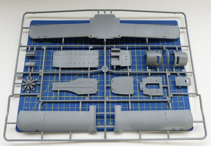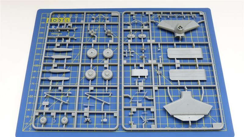 Und man wird nicht enttäuscht. Der Stülpkarton ist voll mit in grau gespritzten Gussästen. 10 an der Zahl. Ein Spritzling aus Klarsichtmaterial mit zweigeteilter Cockpitkanzel liegt dem, Baukasten bei. Alle Bauteile sind hervorragend ausgeführt. Fein versenkte Gravuren und gute Detaillierung versprechen viel Bastelspaß. Der Bausatz besitzt auch wieder fein versenkte Nieten.