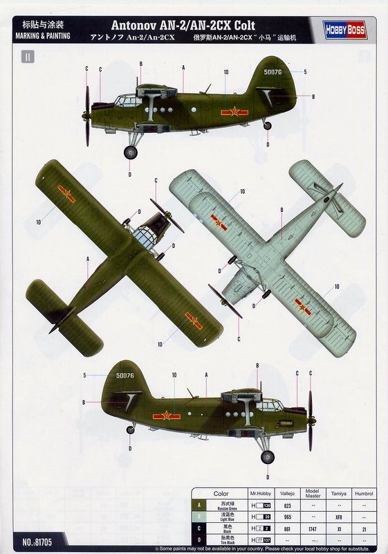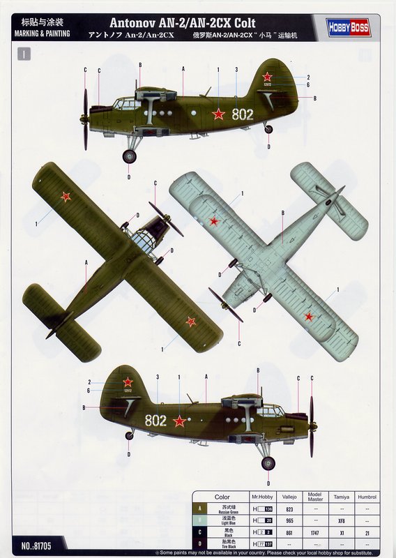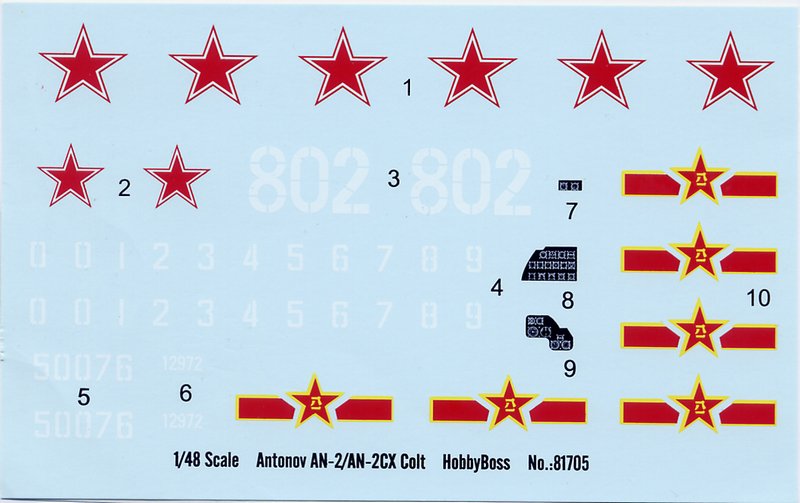 Bemalung und Decals: Bemalungshinweise der An-2 befinden sich wie bei HOBBY BOSS gewohnt auf einem Doppelseitigen DIN A4 Farbdruck. Aus 5 Farbenhersteller kann man auswählen, um das Flugzeug zu bemalen. Leider sind die Angaben nicht komplett. Der Decalbogen lässt den Bau von zwei Maschinen zu. Einer Russischen und einer Maschine aus dem Nachbarland China. Angaben, bei welcher Einheit die Antonow flogen, fehlen leider gänzlich. Leider sind auch keine Wartungshinweise auf dem Decalbogen vorhanden.