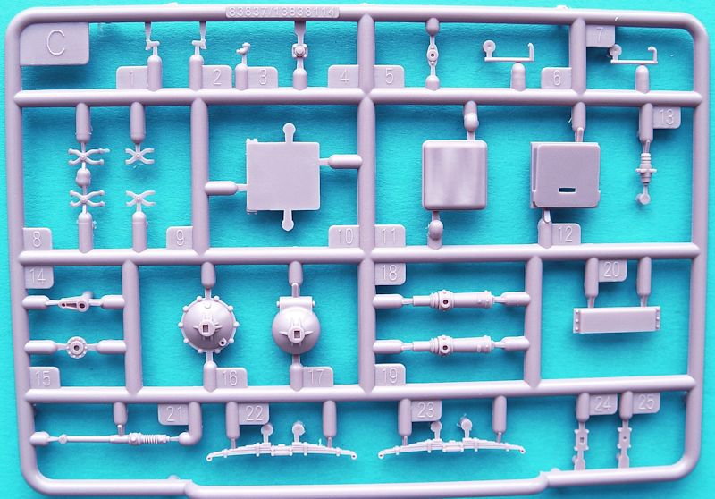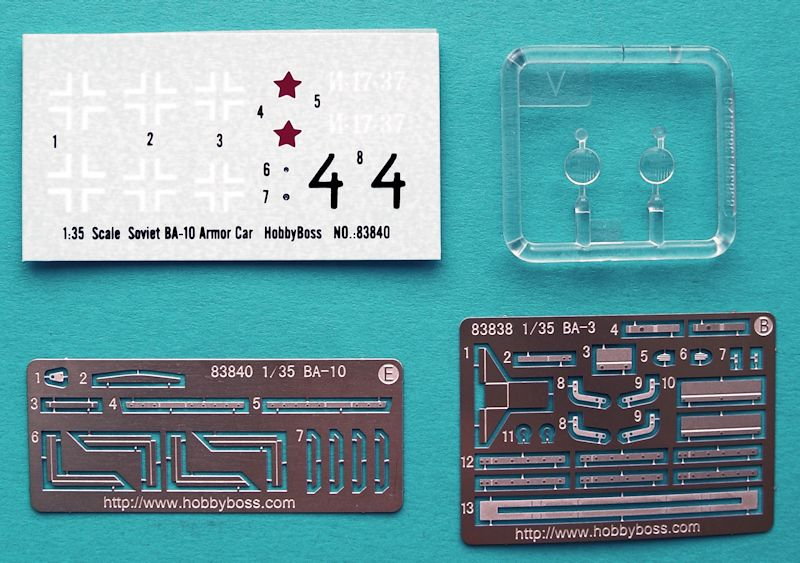 Ein kleiner Bogen aus Klarplastik- für die beiden Scheinwerfer. Solche Bauteile sind sehr wichtig. Leider gibt es einige Bausätze von Hobby Boss wo genau diese fehlen. Zwei kleine Bögen mit Ätzteilen. Wie bei Hobby Boss gewohnt-sehr sicher verpackt. Diese Bögen enthalten die wichtige Teile, auf die man nicht verzichten sollte.