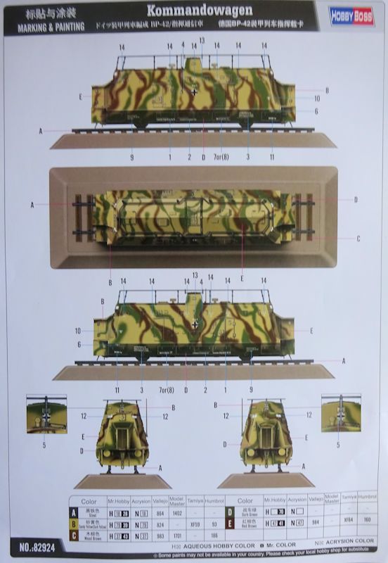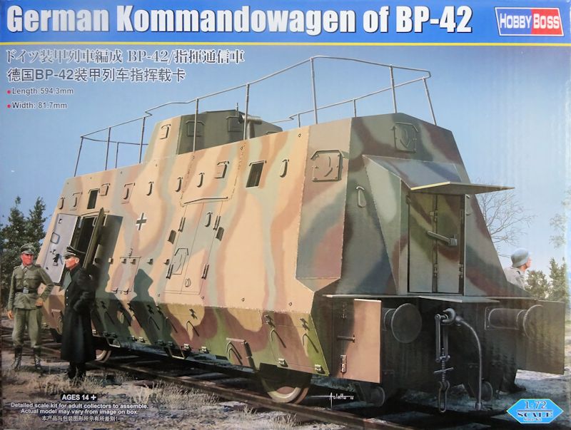 Bausatz: HobbyBoss legt den Kommandowagen als zweites Fahrzeug seines Panzerzuges BP 42 bzw. 44 vor. Geliefert wird ein Fahrzeug mit symmetrischem Aufbau, alle neuentwickelten Wagentypen eines BP 42 sollen aber einen deutlich asymmetrischen Aufbau besessen haben, erst die Waggons des BP 44 bekamen symmetrische Aufbauten auf den zweiachsigen Fahrgestellen des Gattungbezirks "Linz". Eindeutige Fotos sind aber ein großes Problem bei den Standardpanzerzügen, da beschädigte oder zerstörte Waggons oft bunt ausgetauscht wurden.