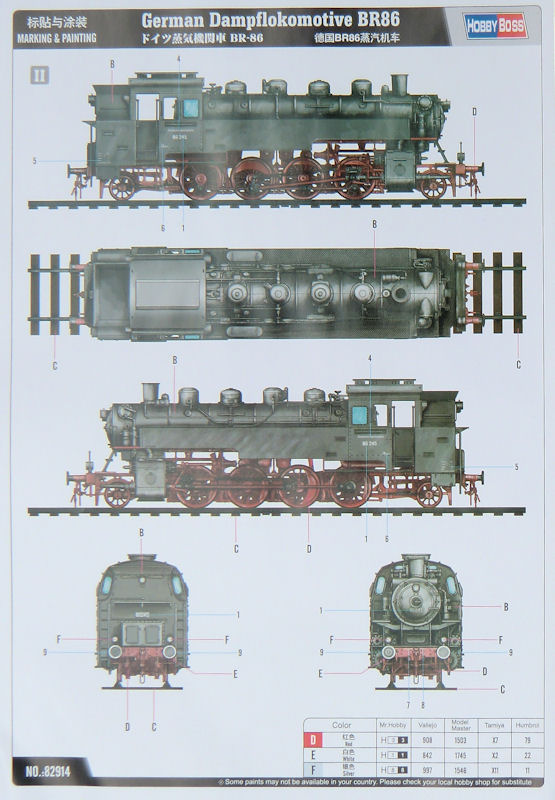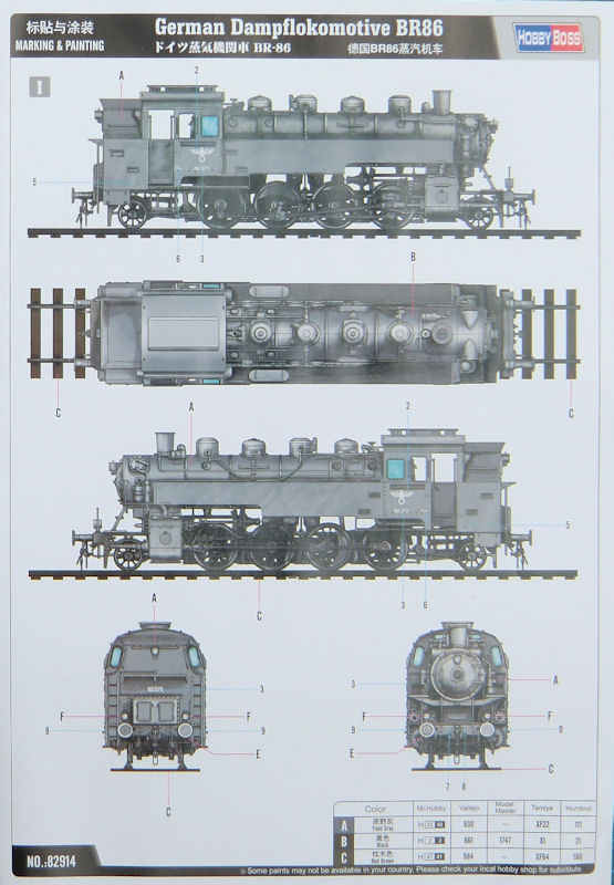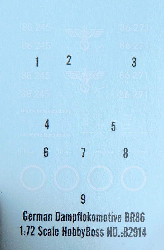 Die Bemalungsanleitung ist mehrfarbig gedruckt und enthält Hinweise zum Anbringen der Decals. Es wird auf die Farbsysteme von Mr.Hobby, Vallejo, ModelMaster, Tamiya und Humbrol verwiesen. Gut gelungen sind auch die Decals selbst. Es gibt eine ordentliche Schrifttype und weiße Ringe für die Puffer.