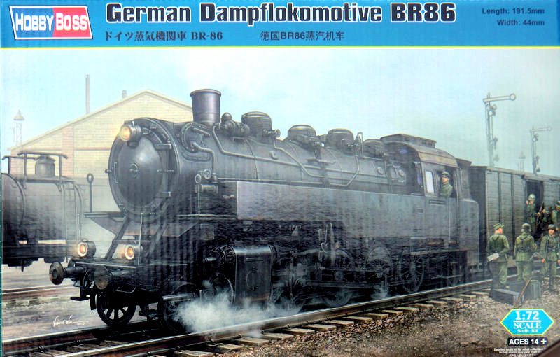 Bausatz: Nachdem die BR 86 in 1/35 bei TRUMPETER erschienen war, war es eine Frage der Zeit bis es beim Schwesterunternehmen HobbyBoss eine Verkleinerung auf 1/72 geben würde. In dem typischen Stülpkarton befinden sich gut neun ockerfarbende Spritzlinge mit 213 Teilen, ein Rahmen mit acht Klarsichtteilen ein kleiner Decalbogen und die recht übersichtliche Bauanleitung.