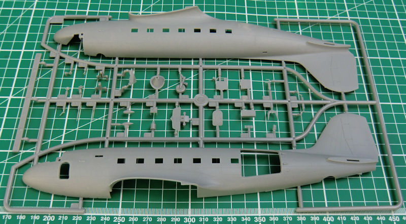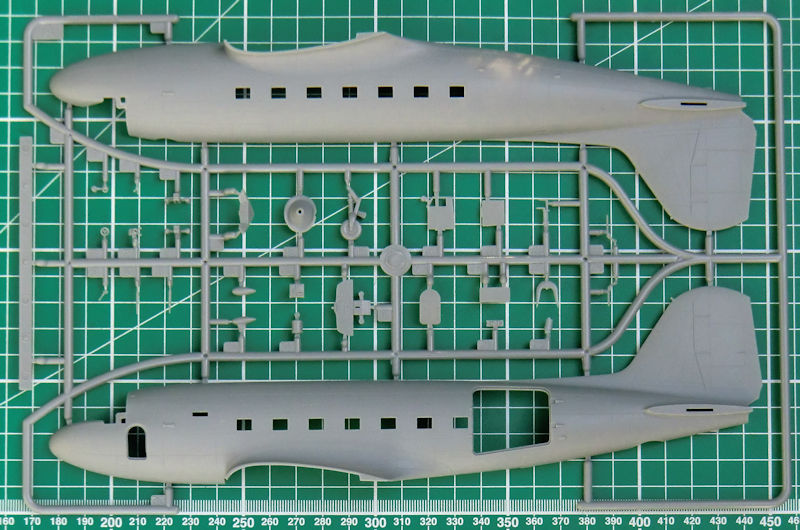 Der Aufbau ist traditionell. Allerdings geht HobbyBoss bei dieser C-47 einige neue Wege. So hat man die Kanzelverglasung am Cockpit recht großzügig gestaltet. Bei dieser C-47 müssen keine Fenster "eingefummelt" werden. HobbyBoss hat auch Wert auf eine gute Inneneinrichtung gelegt. So gibt es nicht nur ein gut gemachtes Cockpit sondern auch der Raum des Technikers ist schön ausgestattet. Leider sieht man davon zu wenig aber man weiß: Es ist da! Weiter hinten im Frachtraum hat man einen detaillierten Boden und die Bänke. Gegenüber der Frachtluke ist die rechte Rumpfinnenseite innen mit Strukturen versehen. Die kleinen Fenster an den Rumpfseiten werden einzeln von innen eingeklebt.