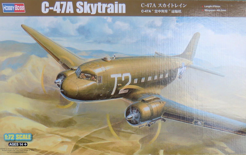 Bausatz: HobbyBoss steht mit seiner neuen Douglas C-47A Skytrain im direkten Wettbewerb zum 2014 erschienenen Airfix-Bausatz in 1/72. Preislich ist Airfix ca. 10 € im Vorteil. HobbyBoss liefert in dem attraktiven praktischen Stülpkarton fünf hellgraue Spritzlinge mit 136 Einzelteilen, ein klarer Spritzling mit 23 Teilen, ein kleiner Fotoätzteilbogen, ein Decalbogen, die mehrfarbige Bemalungsanleitung und die übliche Bauanleitung.