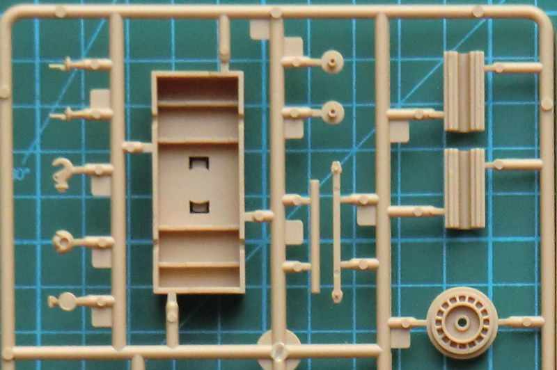 Bausatz: HobbyBoss liefert hiermit eine willkommene Neuheit für den Bereich der Schienenfahrzeuge. In dem stabilen Stülpkarton befinden sich gut verpackt 79 Teile an sechs ockerfarbene Spritzlingen, ein kleiner Decalbogen, eine mehrfarbige Bemalungsanleitung und die Bauanleitung. Bei den Teilen ist auch ein Gleisstück zur Modellpräsentation dabei.