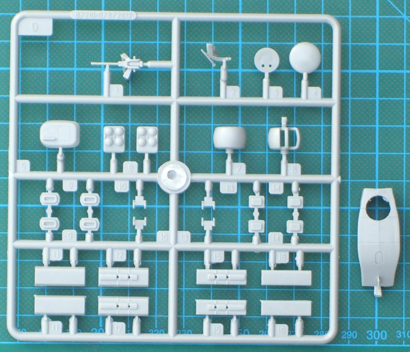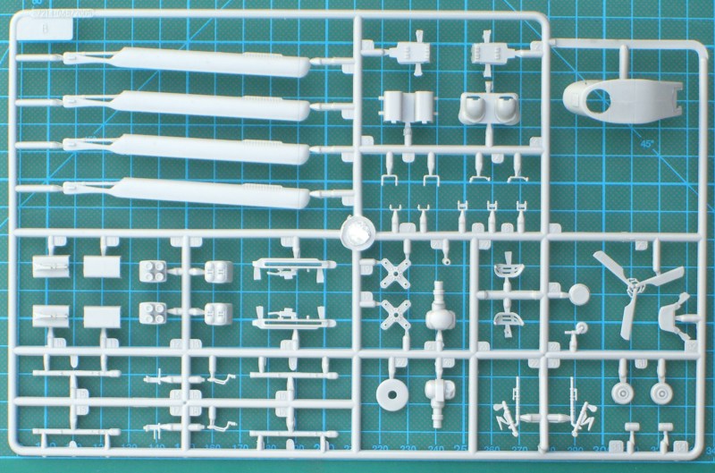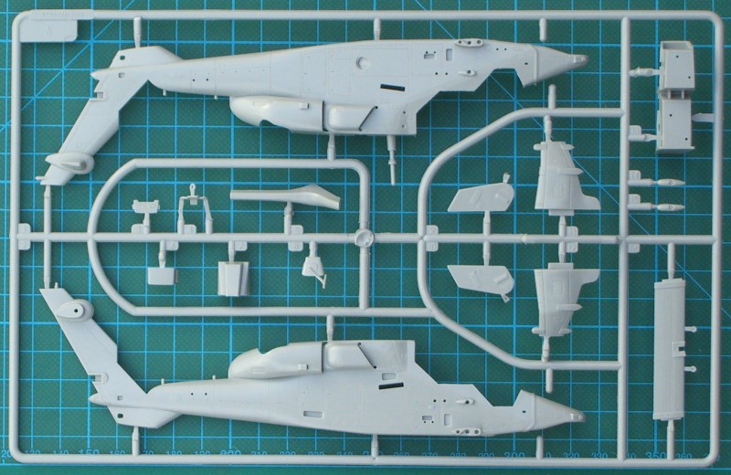 Der Bausatz wird in einem modellbaufreundlichen zweiteiligen Karton geliefert. Er enthält drei hellgraue Spritzlinge und einen Rahmen mit Klarsichtteile. Gleich vorweg: Die Teile sehen sehr gut aus. Es kann nur die Version HAP daraus gebaut werden. Einige Bauteile verbleiben an den Spritzrahmen.