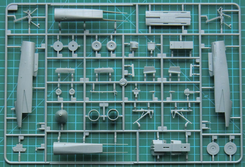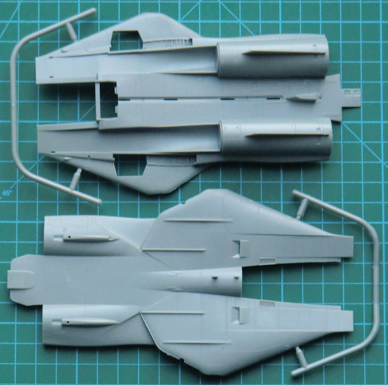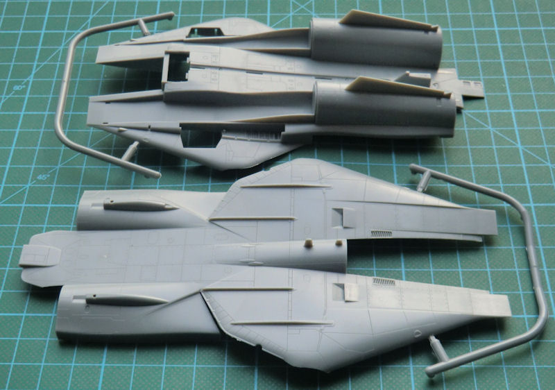 Der Rumpf mit dem Tragflächenansatz besteht aus Ober- und Unterseite. Das Ganze passt gut zusammen. Daher gibt es gut ausgerichtete Triebwerkseinläufe. Die Triebwerksein- und -auslässe sind sehr gelungen. Gleiches gilt auch für das Fahrwerk. So sind die Schächte ordentlich detailliert und die Fahrwerksbeine sind gelungen.