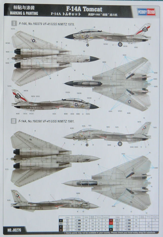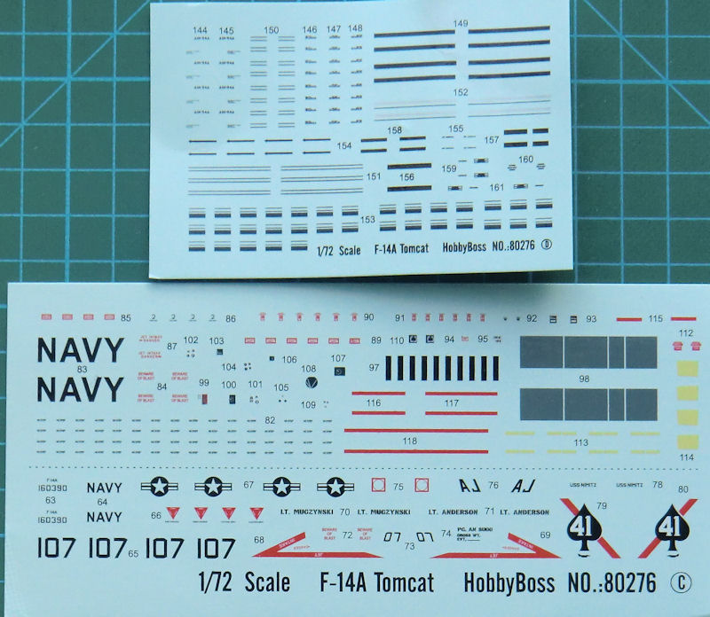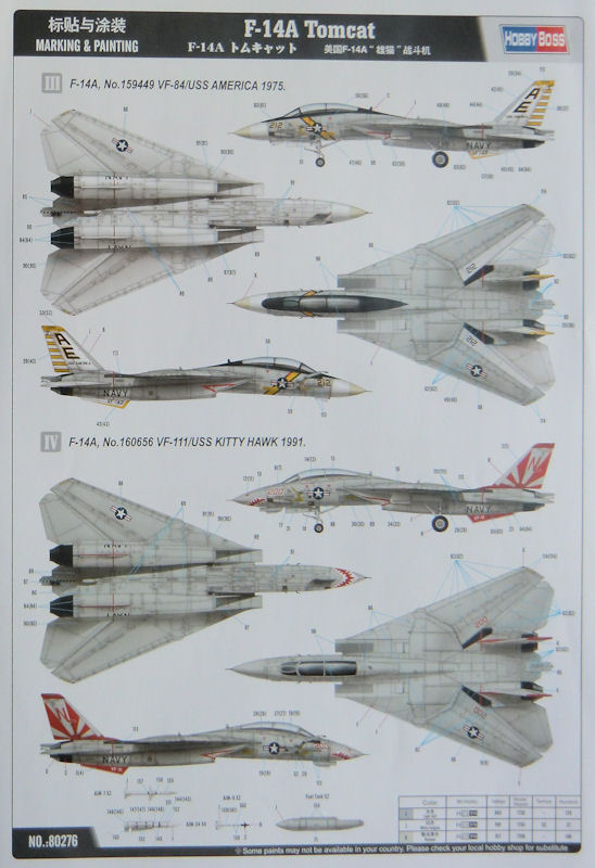 HobbyBoss hat den Bausatz mit vorbildgerechter Unterflügelbewaffnung ausgerüstet. So gibt es AIM-54, AIM-7 und AIM-9. Dazu gibt es noch Tanks. In der Bauanleitung befindet sich ein passender Bestückungsplan.