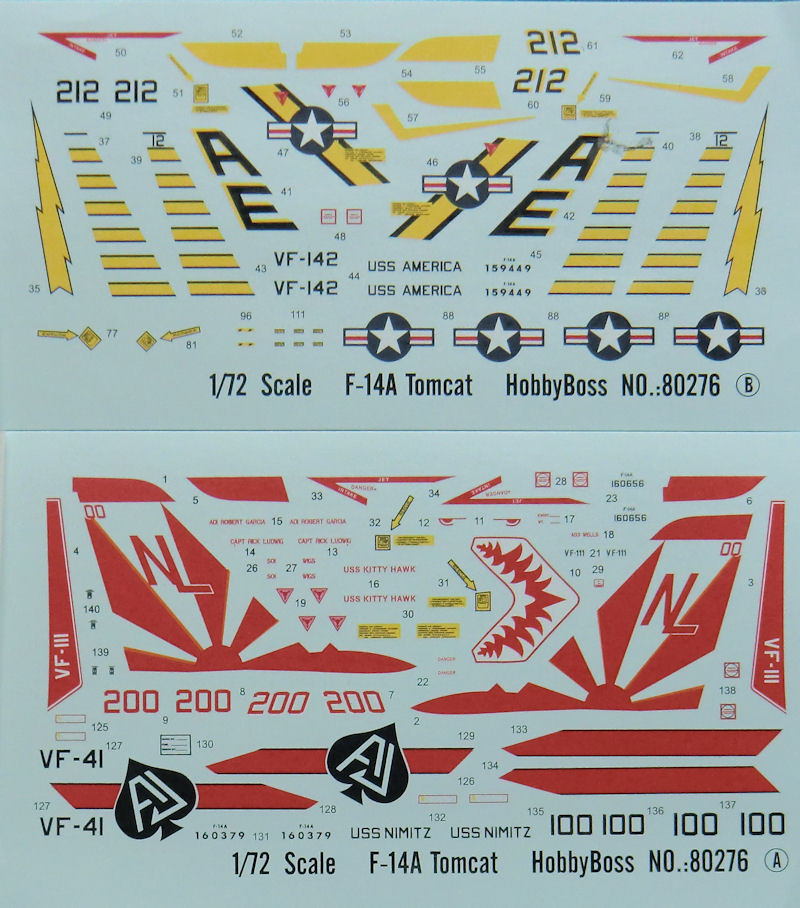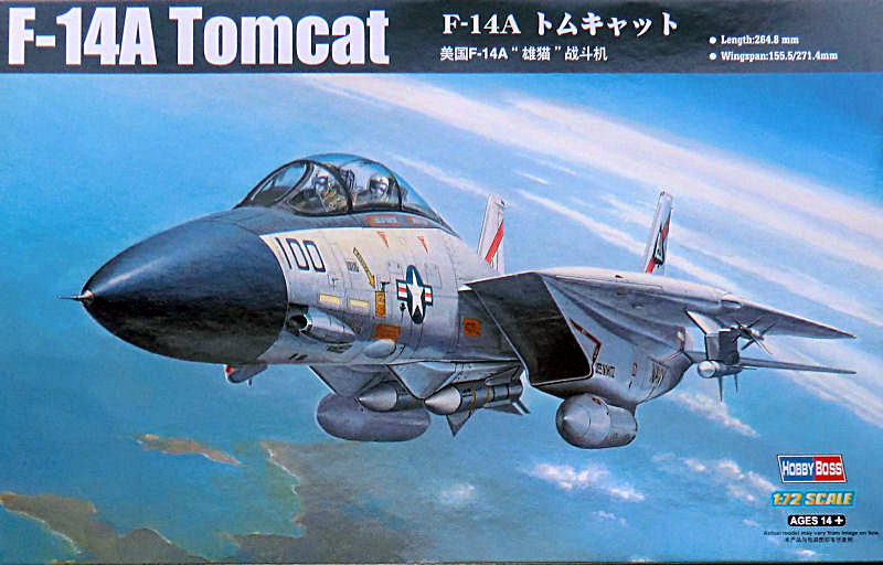 Bausatz: Fast gleichzeitig mit dem 1/48er Bausatz brachte HobbyBoss aus China auch eine 1/72er Grumman F-14A Tomcat heraus. Der praktische attraktive Stülpkarton enthält acht hellgraue Spritzgussrahmen mit insgesamt 100 Teilen, ein Klarsichtrahmen mit zwei Teilen, vier Decalbögen, die übersichtliche Bauanleitung und die mehrfarbige Bemalungsanleitung.