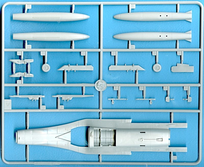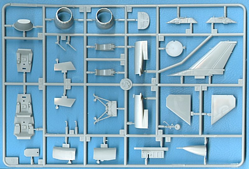 Kennzeichen der einzeln verpackten Spritzlinge ist: sie sind für alle Versionen - bis auf das Seitenleitwerk - identisch. Mit diesem Versuch, mit wenigen Wechselteilen (Teil F=A/B, Teil G=C/D) den Bau aller Versionen mit ihren doch sehr unterschiedlichen Produktionsblöcken zu ermöglichen, landet HB endgültig im Bereich easy. Dabei ist zu beachten, dass die Finne des Teil G zu lang geraten ist.