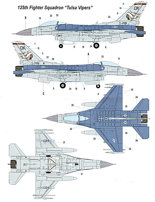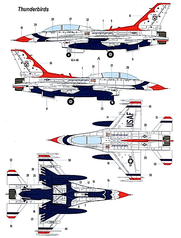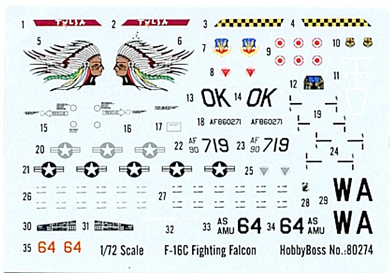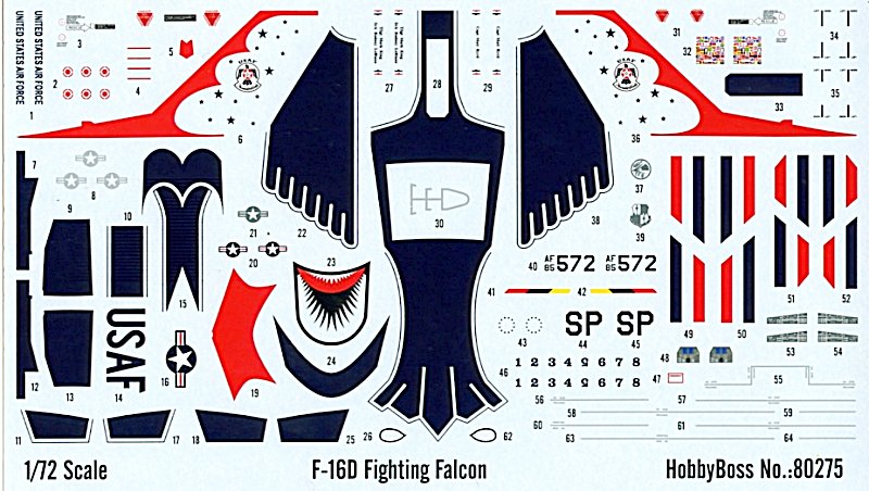 Die beiliegenden Schiebebilder erlauben die Darstellung von jeweils zwei Maschinen. Hier hat Hobby Boss bei der F-16D mit den Thunderbirds einen Hingucker geliefert, wäre aber besser beraten gewesen dafür einen Einsitzer zu wählen. Warum gerade bei der C/D nur auf US-Maschinen zurückgegriffen wurde ist mir nach den bisherigen Vorlagen nicht verständlich.