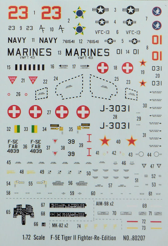 Die Spritzgussteile haben nicht ganz das heutige hohe Niveau von HobbyBoss, wie man es z.B. bei der Panther oder Sea Hawk findet. Die Großbauteile passen zusammen und das Modell sieht nach F-5E aus. Das Cockpit besteht aus einer Wanne, einem aus drei Teilen bestehenden Schleudersitz, dem Instrumentenbrett und dem Steuerknüppel. Auf den im Kit befindlichen Piloten geht die Bauanleitung nicht ein. Fürs Instrumentenbrett gibt es ein Decal.