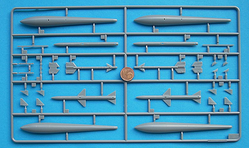 Die Flügel können getrennt und mit Spanten versehen werden, um hochgeklappt dargestellt werden zu können. Leider muss man hier wohl selbst recherchieren, da das Ganze doch sehr vereinfacht wirkt. Außenwaffen liegen in Form von zwei Sparrows und zwei Sidewindern bei. Dazu noch zwei Abwurftanks. Die Teile mit den Kanonenausschussöffnungen sind zwar separat gespritzt, aber die Durchbrüche für die 20mm Kanonen sind nur flache Dellen. Hier hat sich HB womöglich zu genau an den Grand Phoenix Kit gehalten, man sollte diese jedenfalls nach Vorbildfotos verbessern.