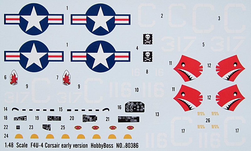 Da die Abziehbilder aus China ohnehin oft "anspruchsvoll" sind, lohnt sich ein Blick auf den Zubehörmarkt. Ich hab jedenfalls noch einen Decalsatz mit dem Markierungen von Kenneth Walshs F4U-4 im Schrank...