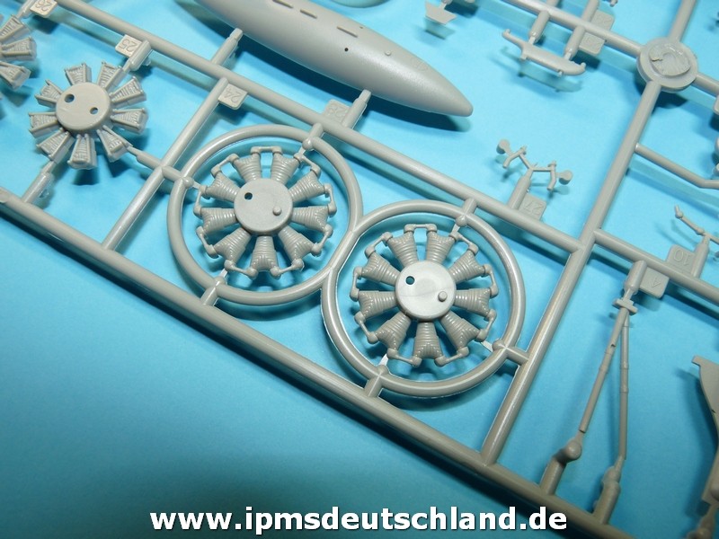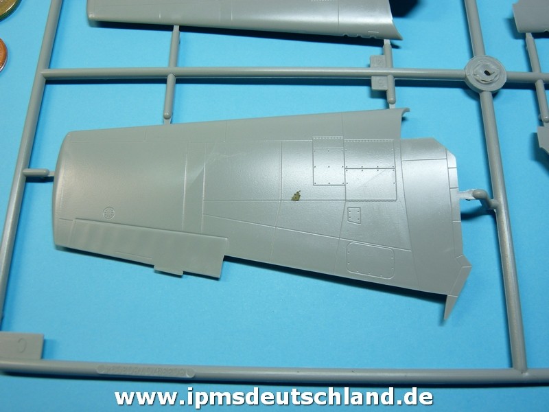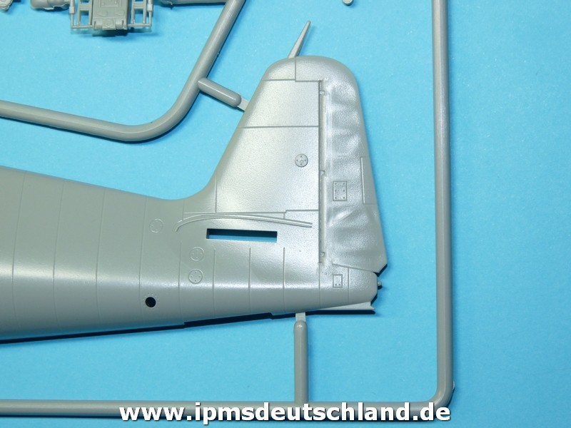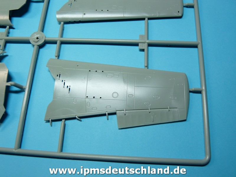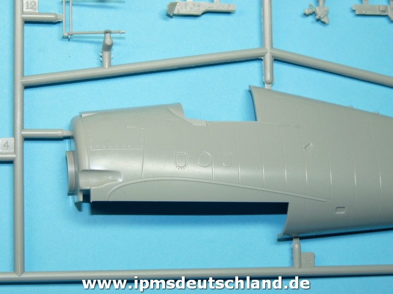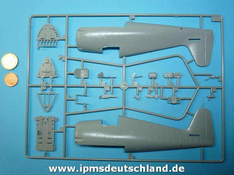 Die Bauteile selbst sind zeitgemäß mit feinen, sauberen versenkten Gravuren versehen. Ich meine zwar, diese sind nicht ganz so scharf wie auf dem Eduard-Modell, aber der Unterschied ist marginal. Die Kabinenhaube ist zweiteilig ausgeführt. Allerdings sieht die Bauanleitung keine zweite – geöffnete – Einbauvariante vor. Die Cockpitdetaillierung ist für meine Erwartungen ansprechend. Als besonderes Merkmal, das den Bausatz von den aller anderen Hersteller unterscheidet, ist die Option, die Faltflügel angeklappt darzustellen – ähnlich wie Tamiya das mit seiner F4U Corsair-Reihe gemacht hat.